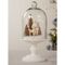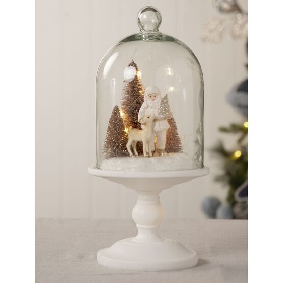 The LED Glass Cloche Ornament - Santa, Deer & Bottle Brush Christmas Tree 29cm offers a refined festive accent for any interior. A glass dome rests on a pedestal, containing a miniature winter scene with a small white animal, possibly a polar bear or a dog, surrounded by small evergreen trees and a snowy landscape. Gentle LED illumination highlights the intricate details and soft textures within. Complete the look with more serene pieces from the Frosted Haven collection.