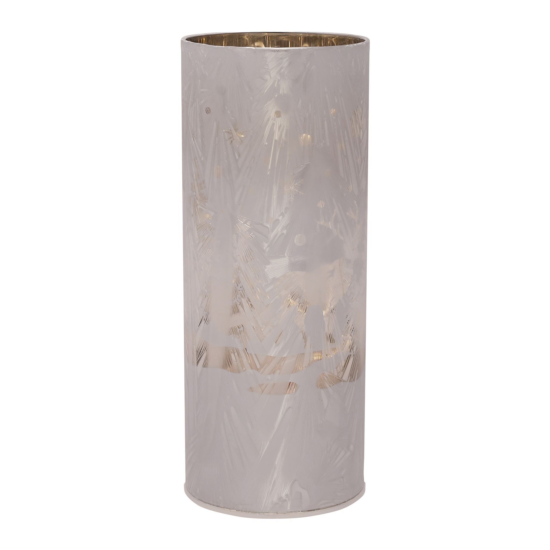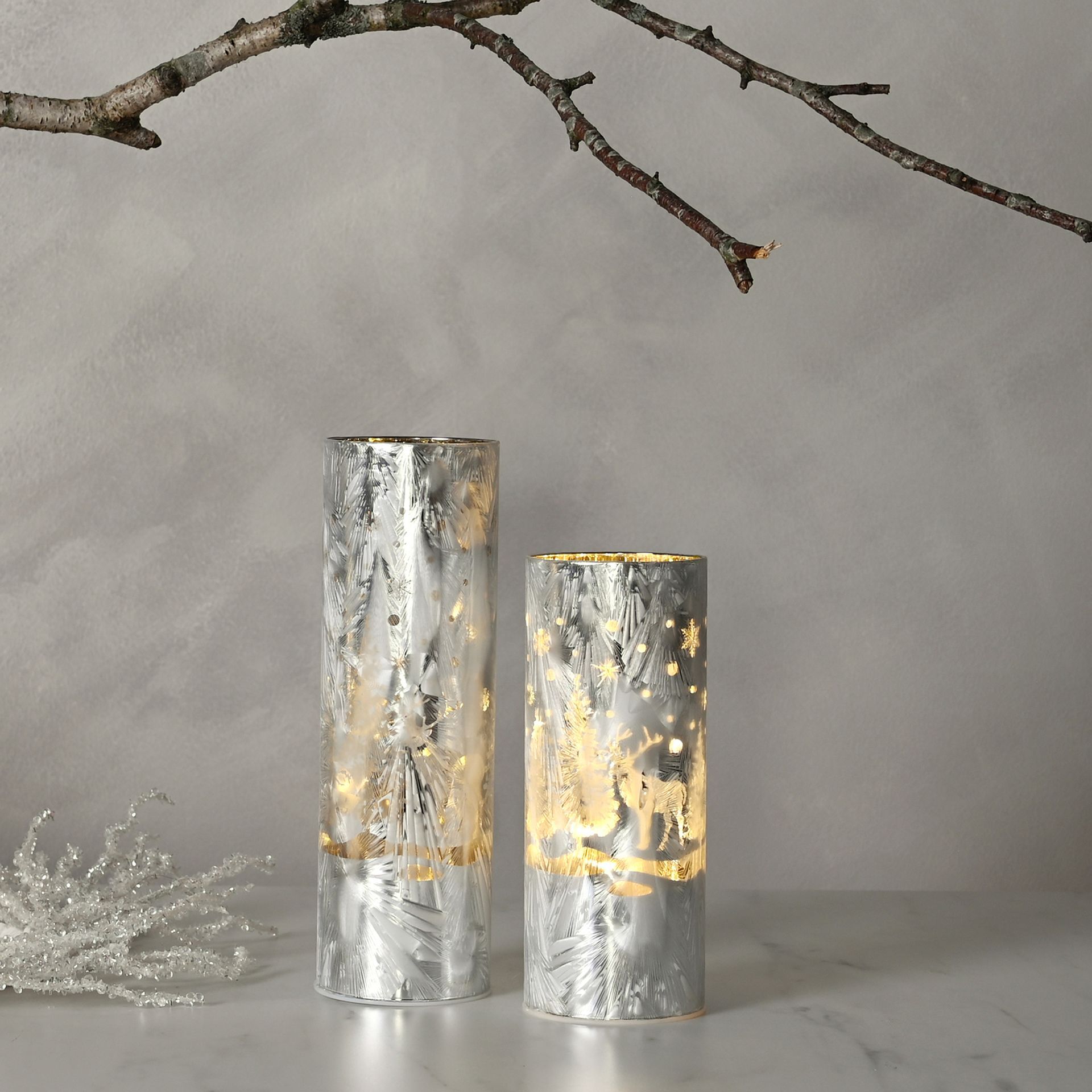 The cylindrical, etched glass tube light showcases a gorgeous forest scene with reindeer. Its LED lights shine brightly, which bring its gorgeous design to life during Winter evenings at home.