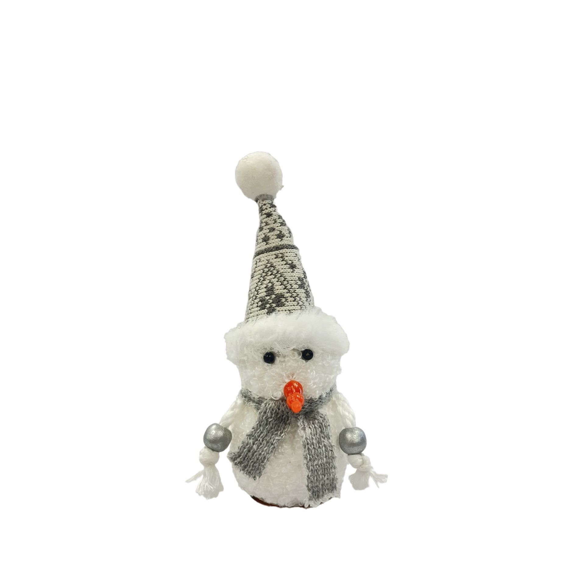 This plush snowman figure, dressed in a patterned hat and scarf combines soft fabric textures for a playful look.