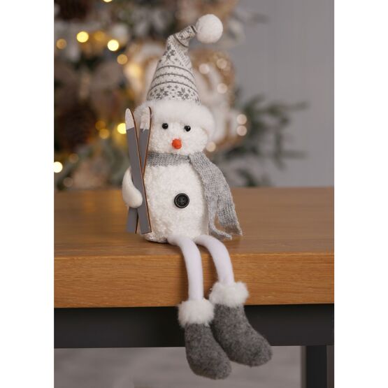 **MULTI 6** Fabric & Wood Snowman Mantel Decoration with Skis Seated with Dangling legs