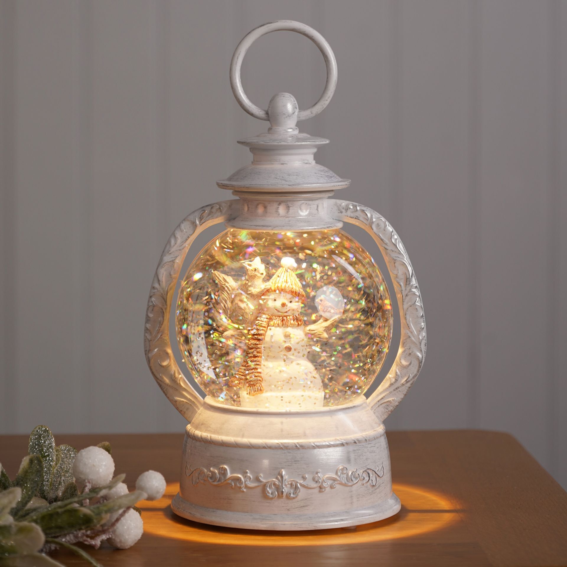 The Musical & Swirling Glitter Lantern with Warm White LED (Requires 3 x AA Batteries not included) creates a refined focal point for festive interiors.