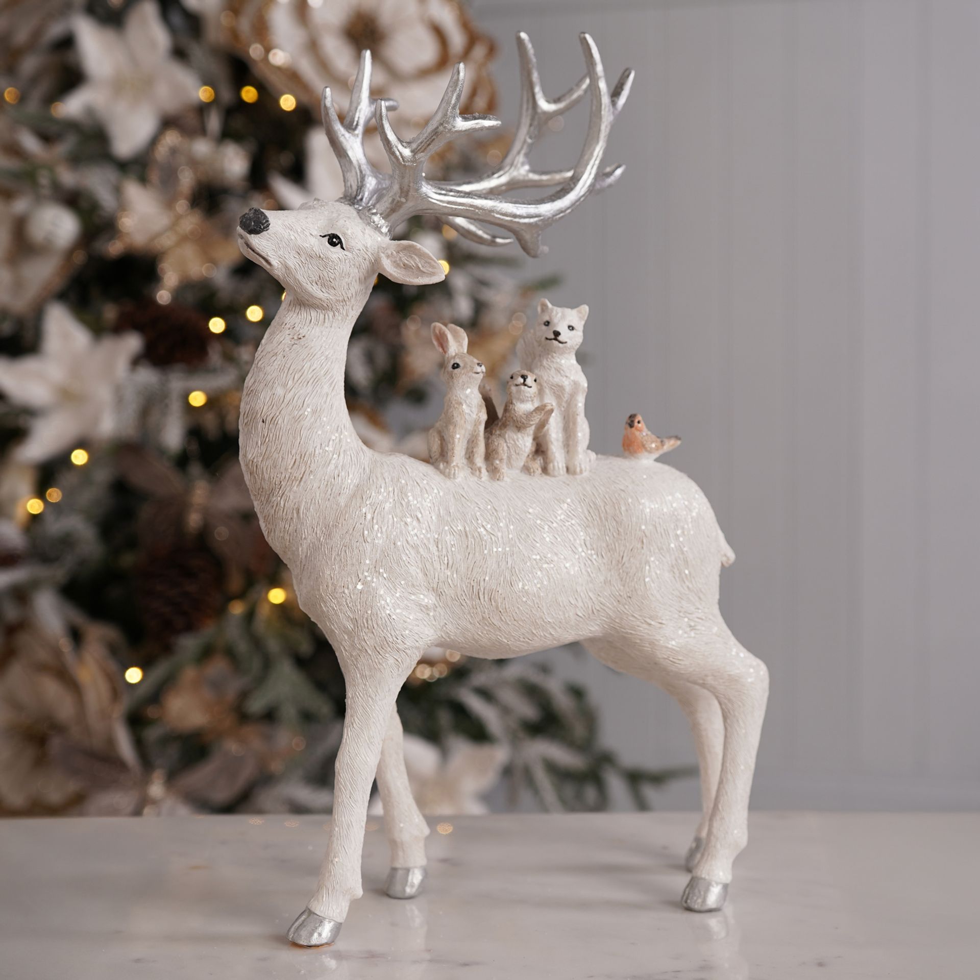 The Resin Silver Sparkle Animals On A Standing Reindeer Figurine - 35cm is a charming centrepiece for festive interiors.