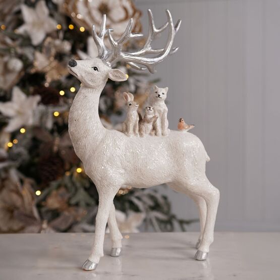 Resin Silver Sparkle Animals On A Standing Reindeer Figurine - 35cm