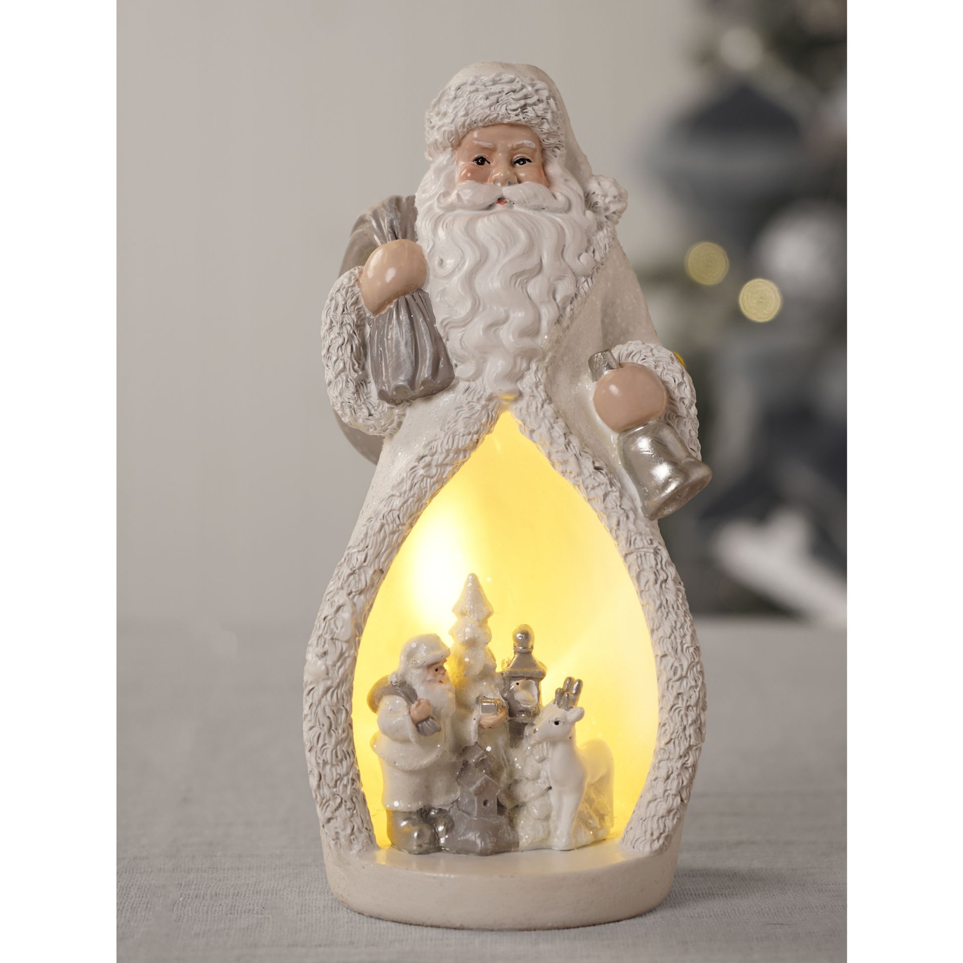 Resin Silver Sparkle Santa with Scene inside Coat and LED Lights (Includes Batteries)