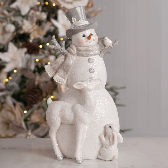 The Resin Silver Sparkle Snowman with Animals - 30cm lends a charming seasonal accent to any festive setting.