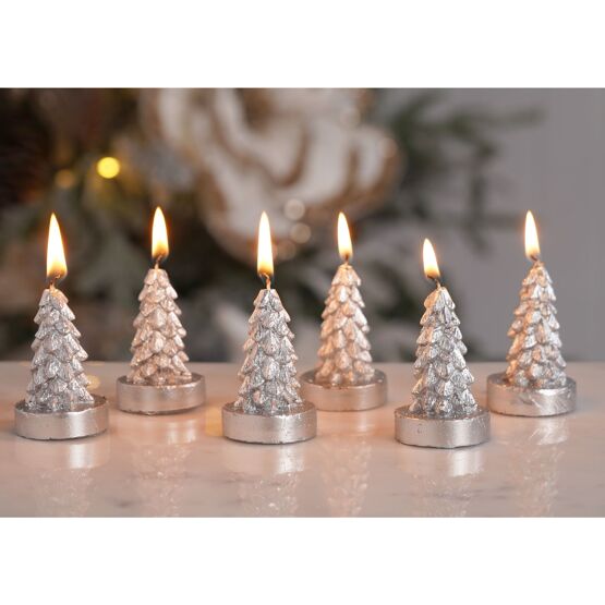 The Set of 6 Silver Sparkle Christmas Tree Tealight Candles in Gift Box offers a refined accent for festive tables and winter interiors.