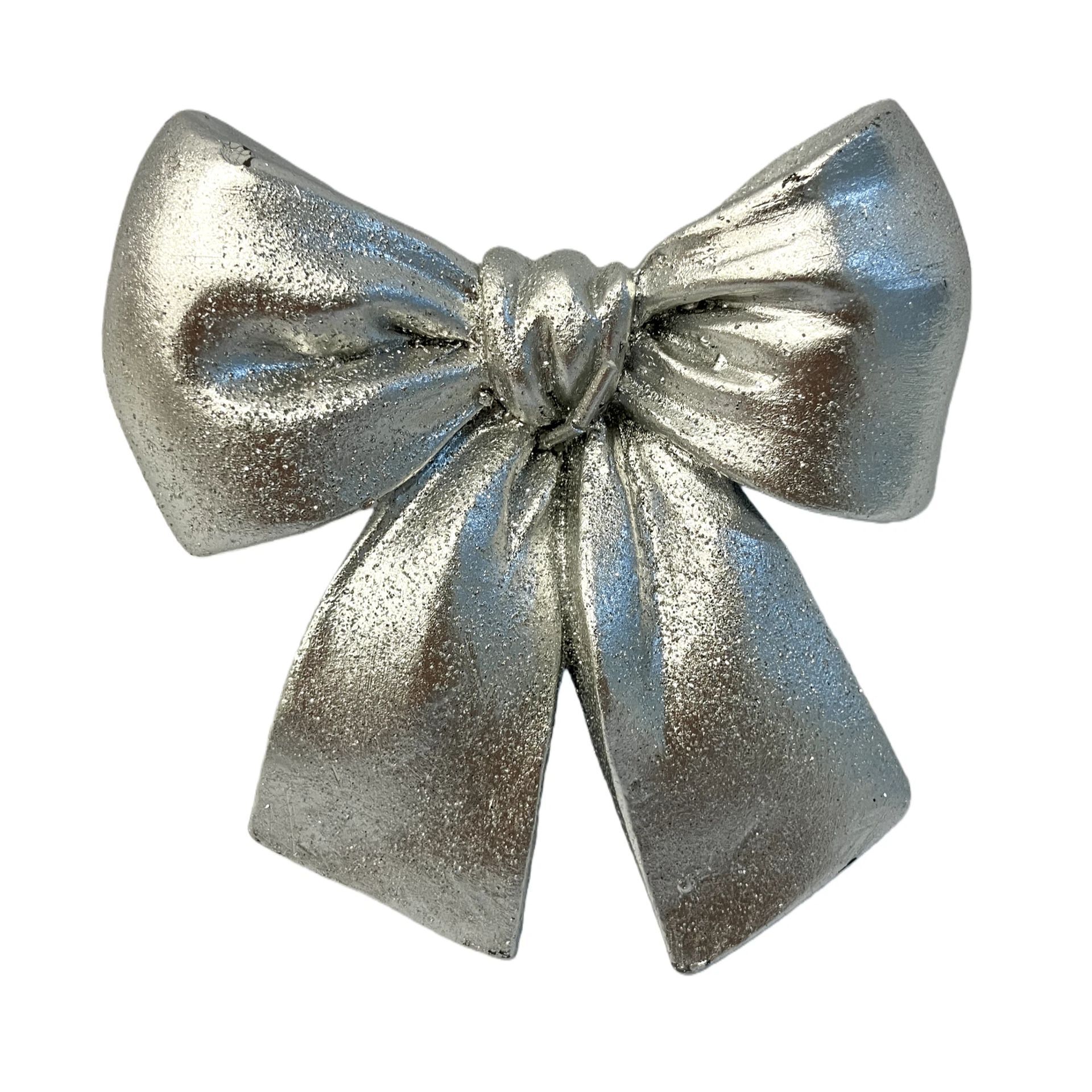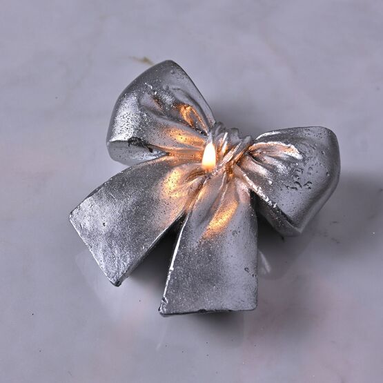 A metallic silver bow-shaped candle features a glowing orange centre, creating a subtle interplay of shimmer and warmth. The sculpted form and lustrous finish evoke a sense of modern elegance, while the playful bow silhouette nods to classic Christmas charm.