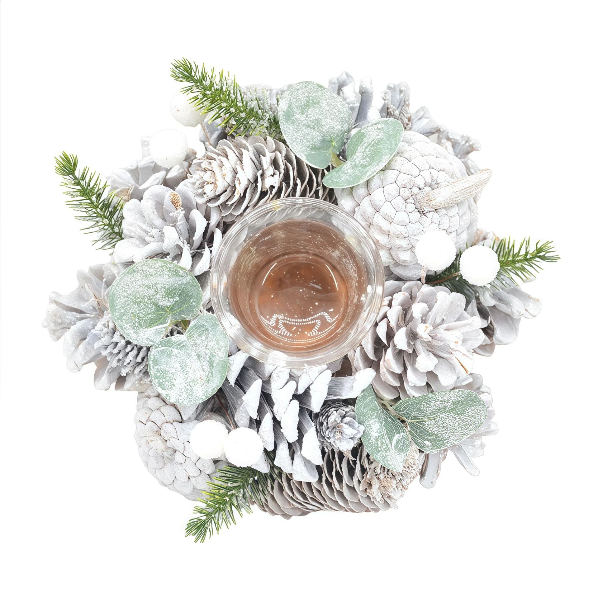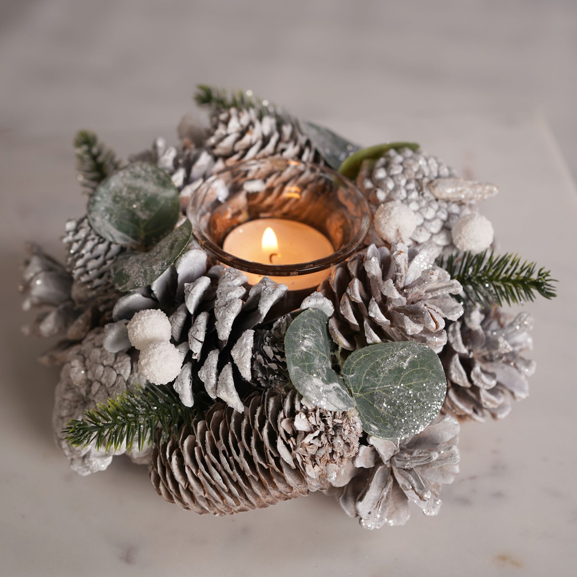 The Silver Sparkle Candle Holder with 1 Glass 18cm introduces a refined centrepiece for seasonal interiors. A festive winter wreath composed of white and silver pine cones, evergreen sprigs, and a glass candle holder in the centre creates a harmonious blend of texture and subtle shimmer. The arrangement is thoughtfully designed for understated elegance. Complete the look with more serene pieces from the Frosted Haven collection.