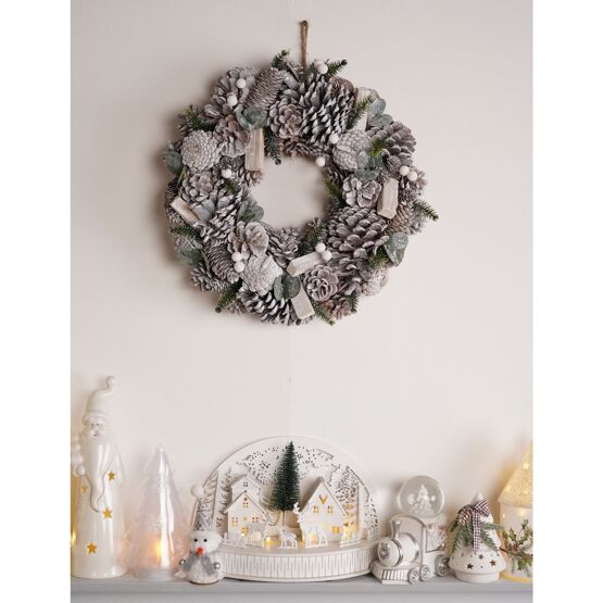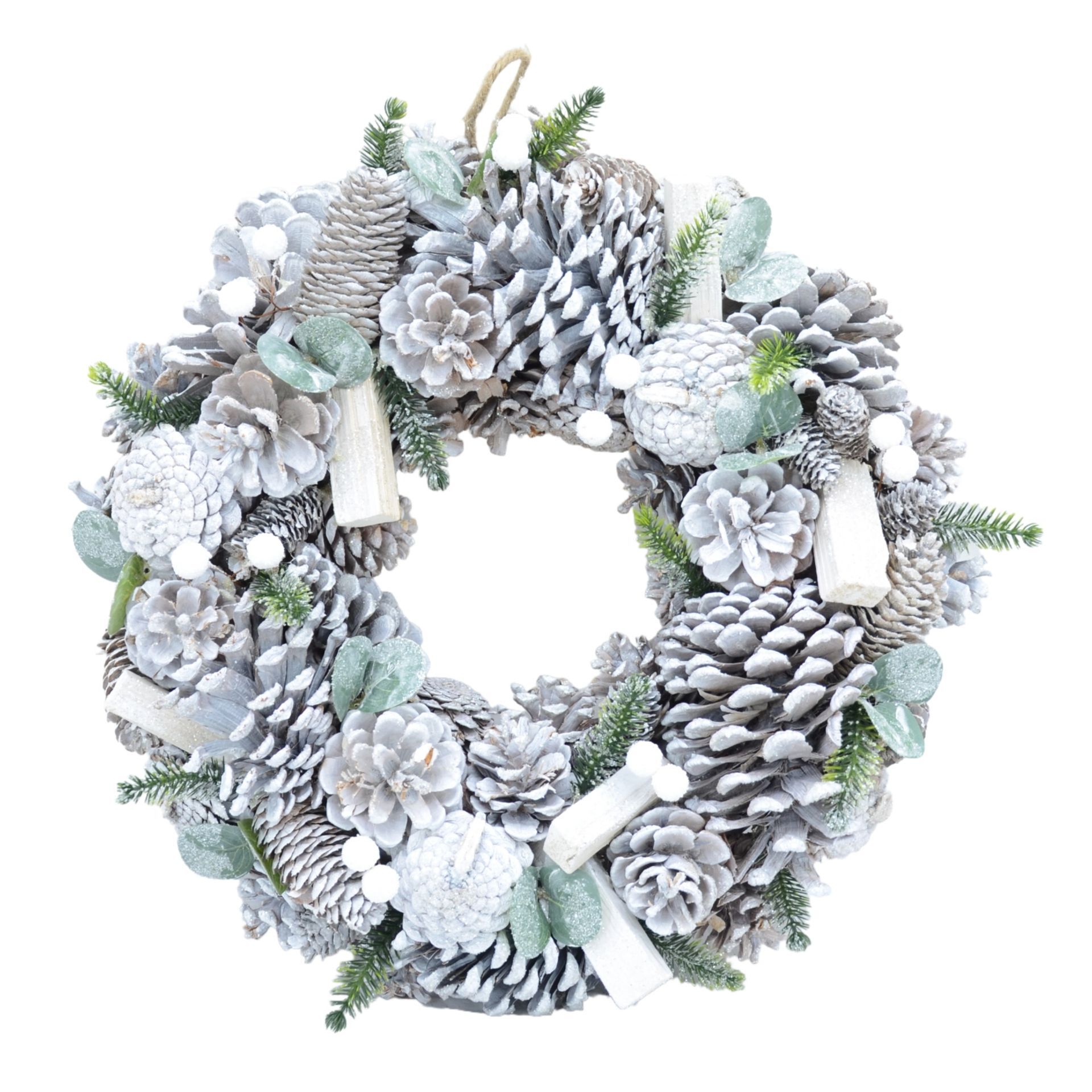 A beautiful winter wreath made of pine cones, greenery, and other natural elements, creating a serene and festive decoration. Subtle silver accents add a gentle shimmer, enhancing its natural textures and understated charm.