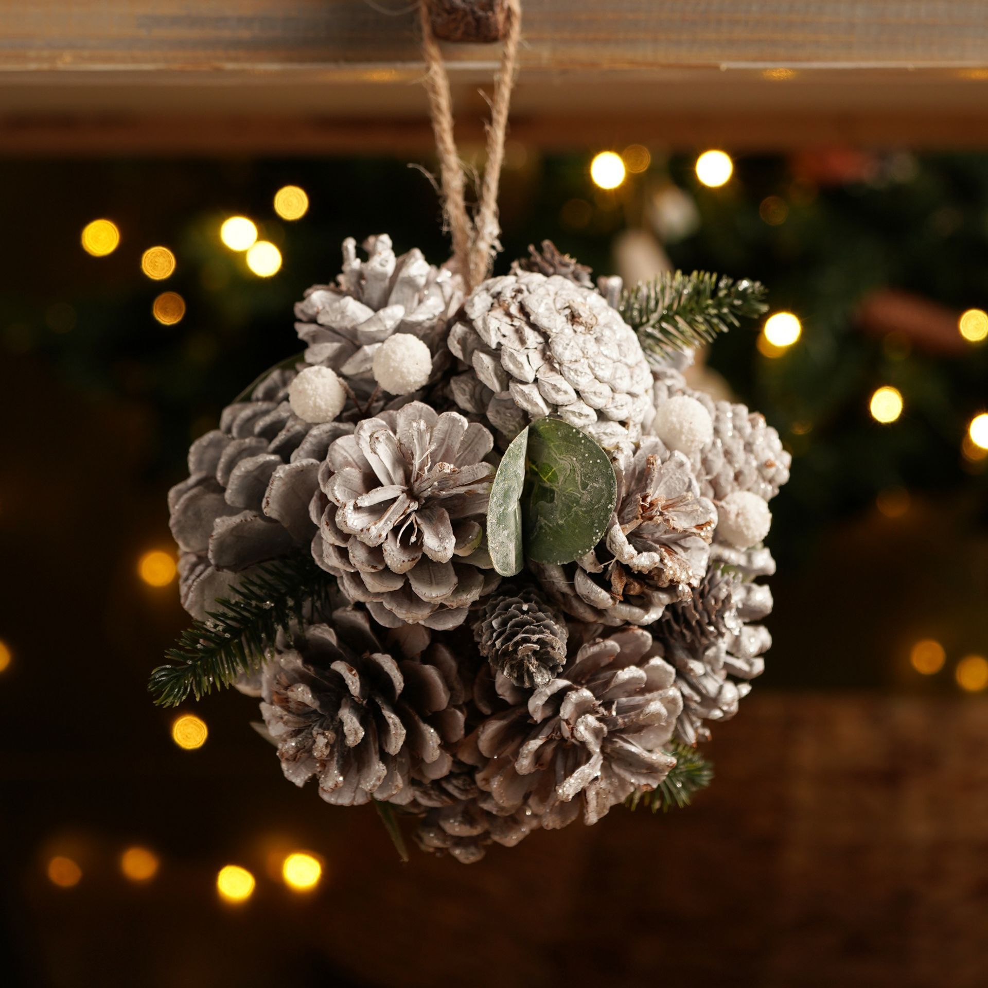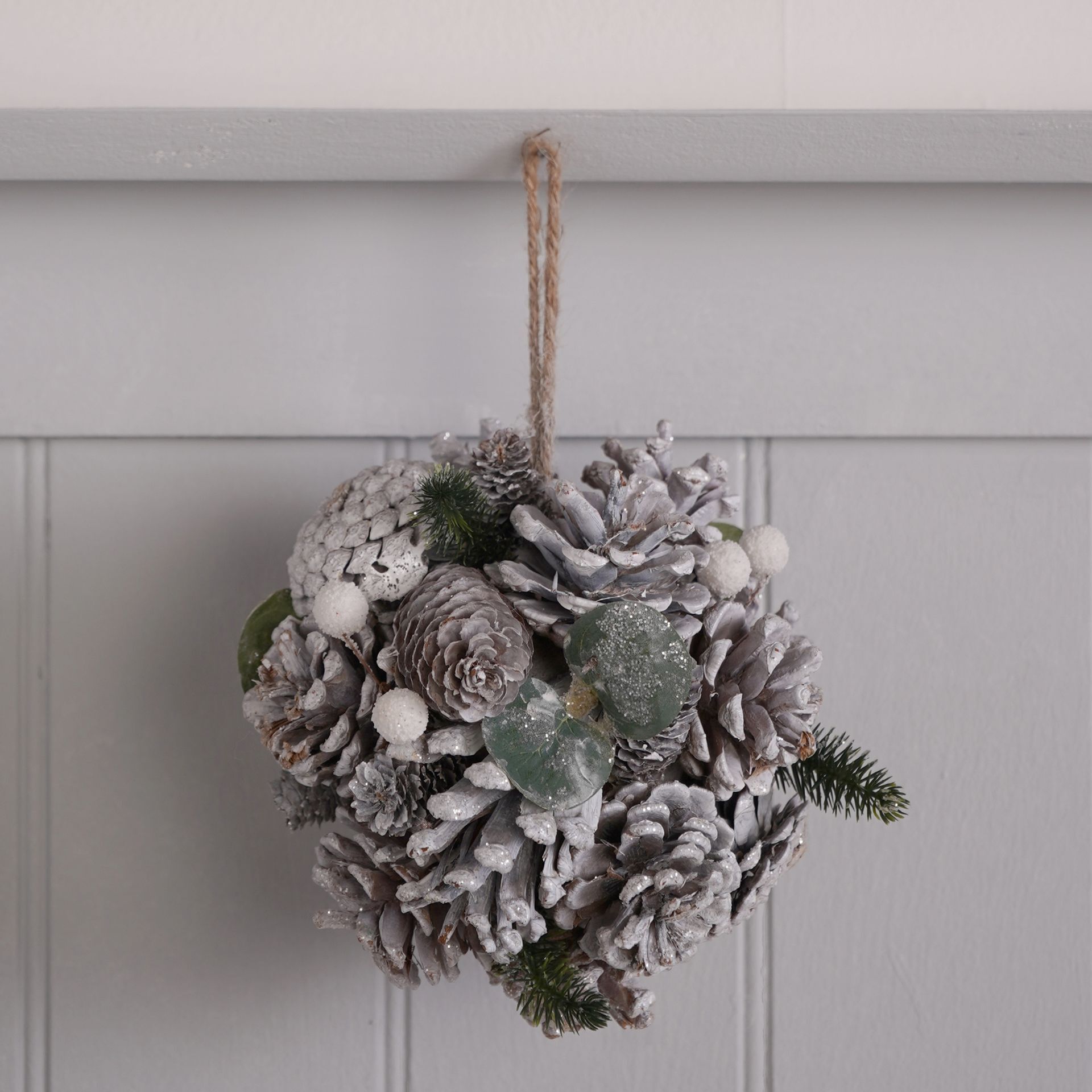 The Silver Sparkle Natural Hanging Ball 16cm is an elegant accent that introduces a refined, organic element to winter interiors.