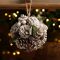 A decorative spherical ornament composed of various natural elements, including pine cones, ferns, and other greenery, it is finished with a silver dusting that adds subtle festive shimmer.