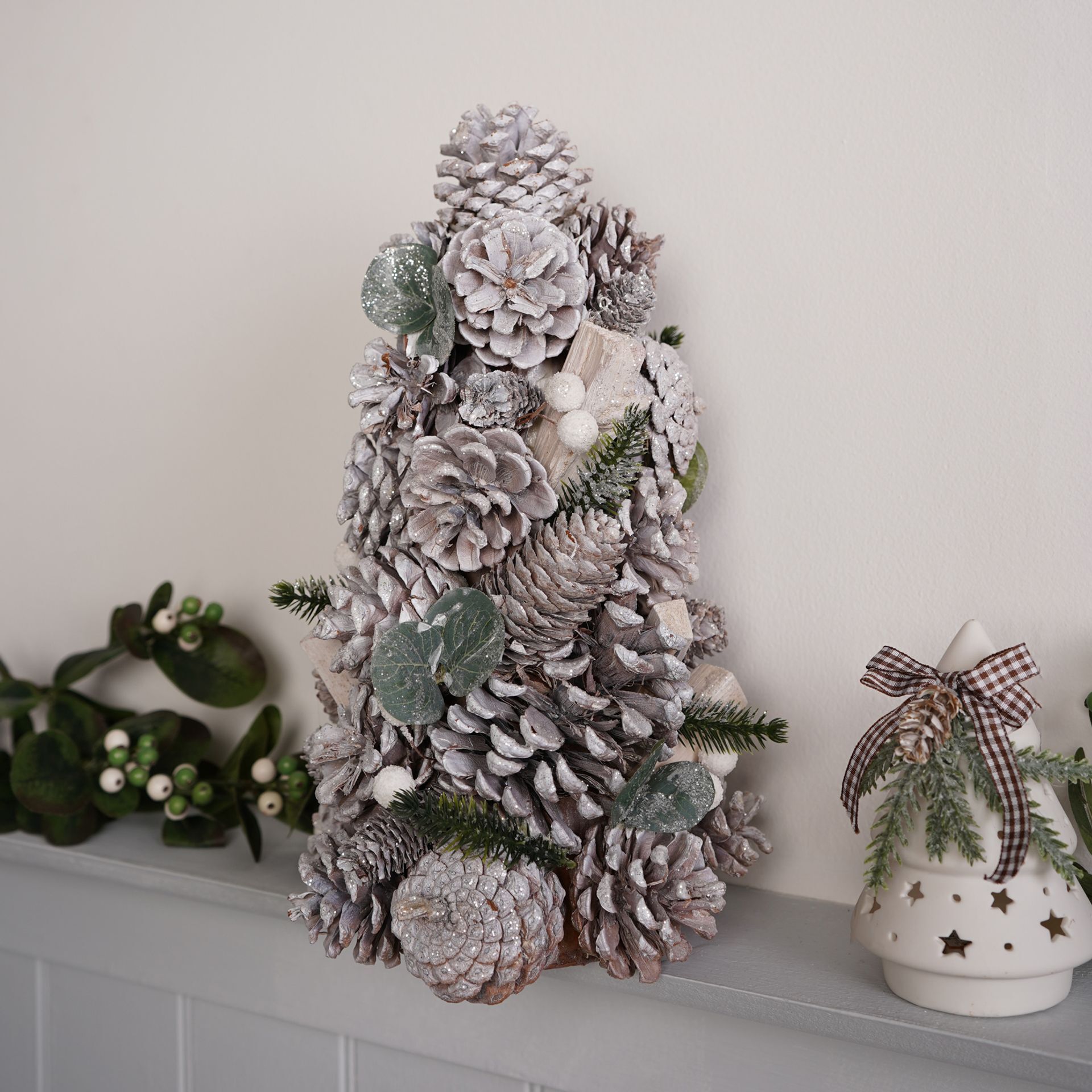 The Silver Sparkle Natural Tree Shape In Cones embodies festive woodland charm with a refined, nature-inspired design. Pine cones, greenery, and other natural elements form a classic tree shape, finished with a silver sparkle for a gentle shimmer.