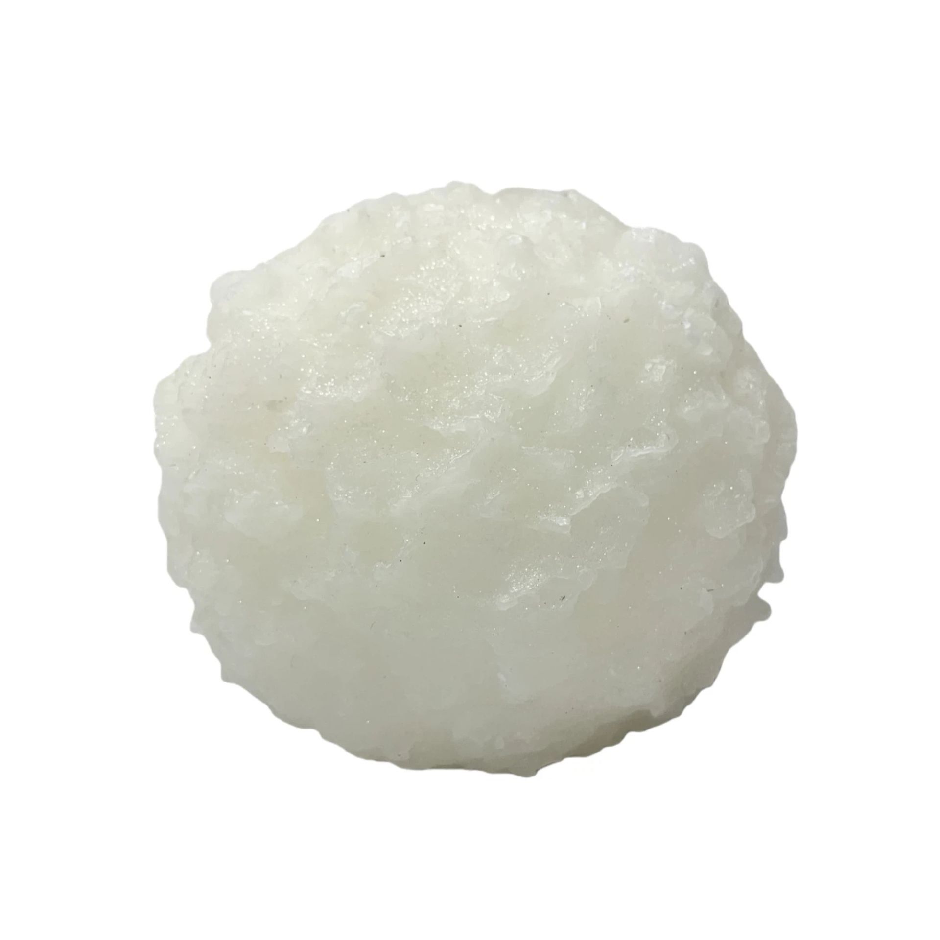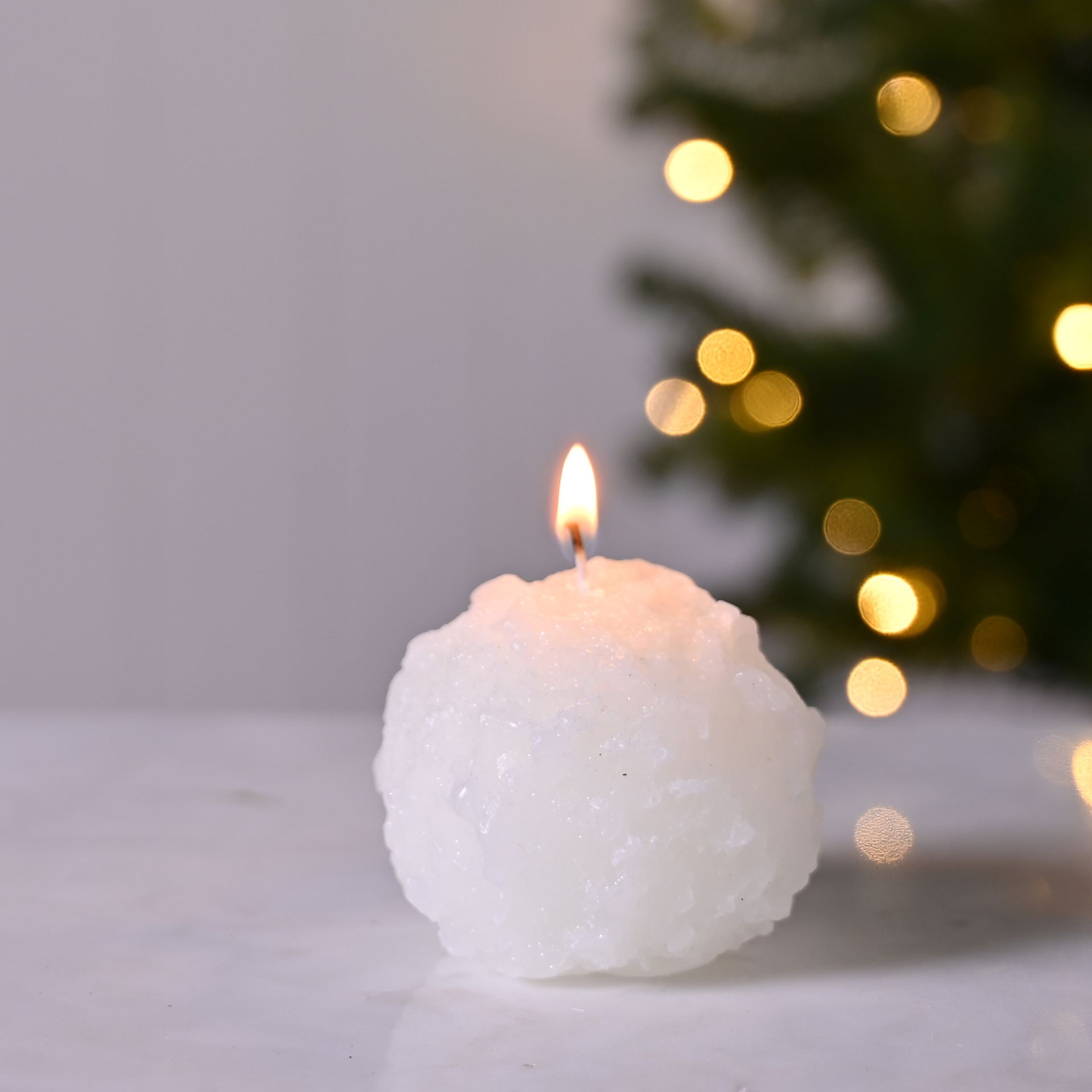 This snow ball shaped candle's gently rounded form reminiscent of freshly fallen snow. The smooth wax finish and subtle shimmer evoke the magic of a wintry Christmas morning.