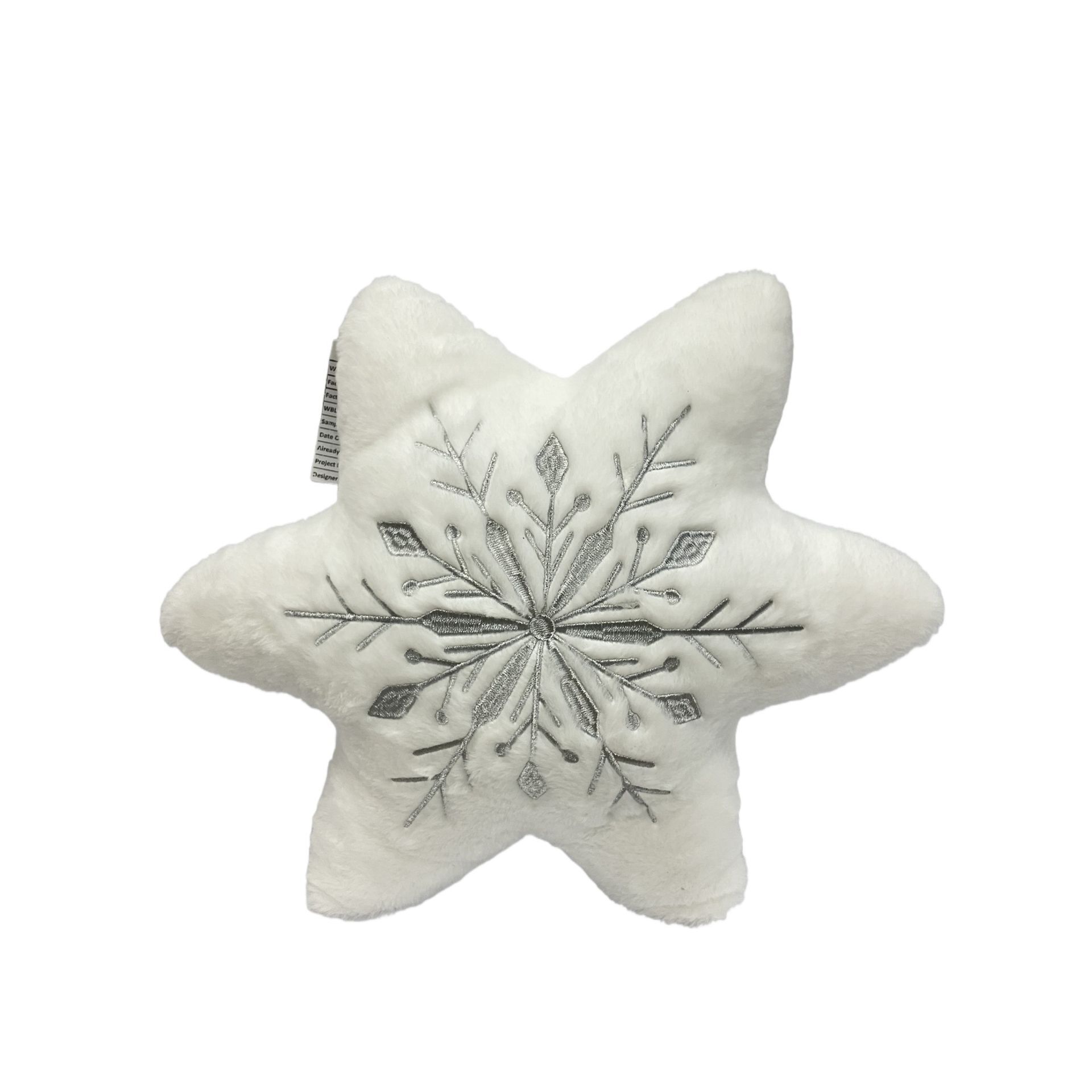 A soft, plush white cushion, shaped with clean lines and finished with a delicate silver snowflake pattern embroidered across its surface, creates a subtle yet sophisticated statement. The understated design lends a gentle wintry charm to any setting.
