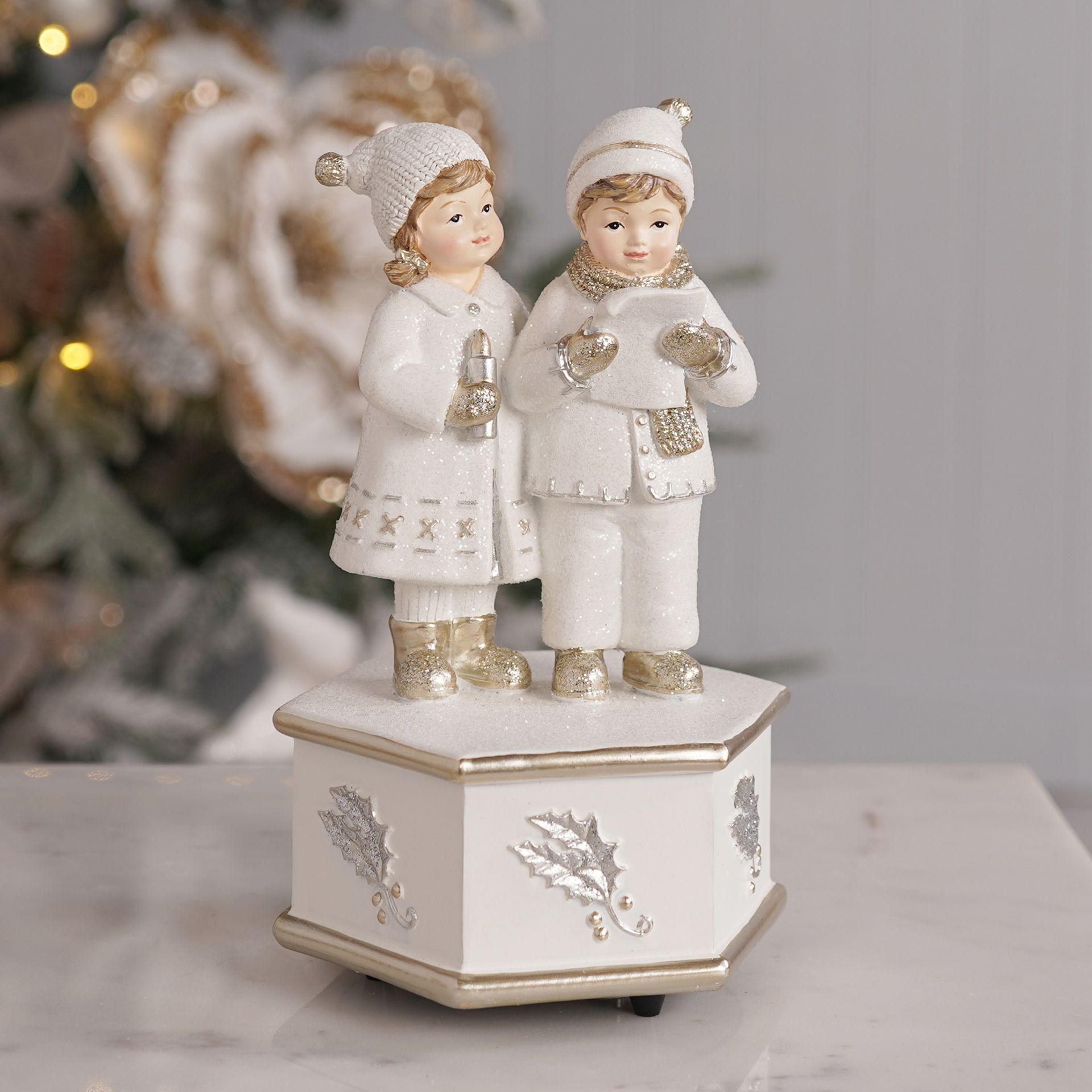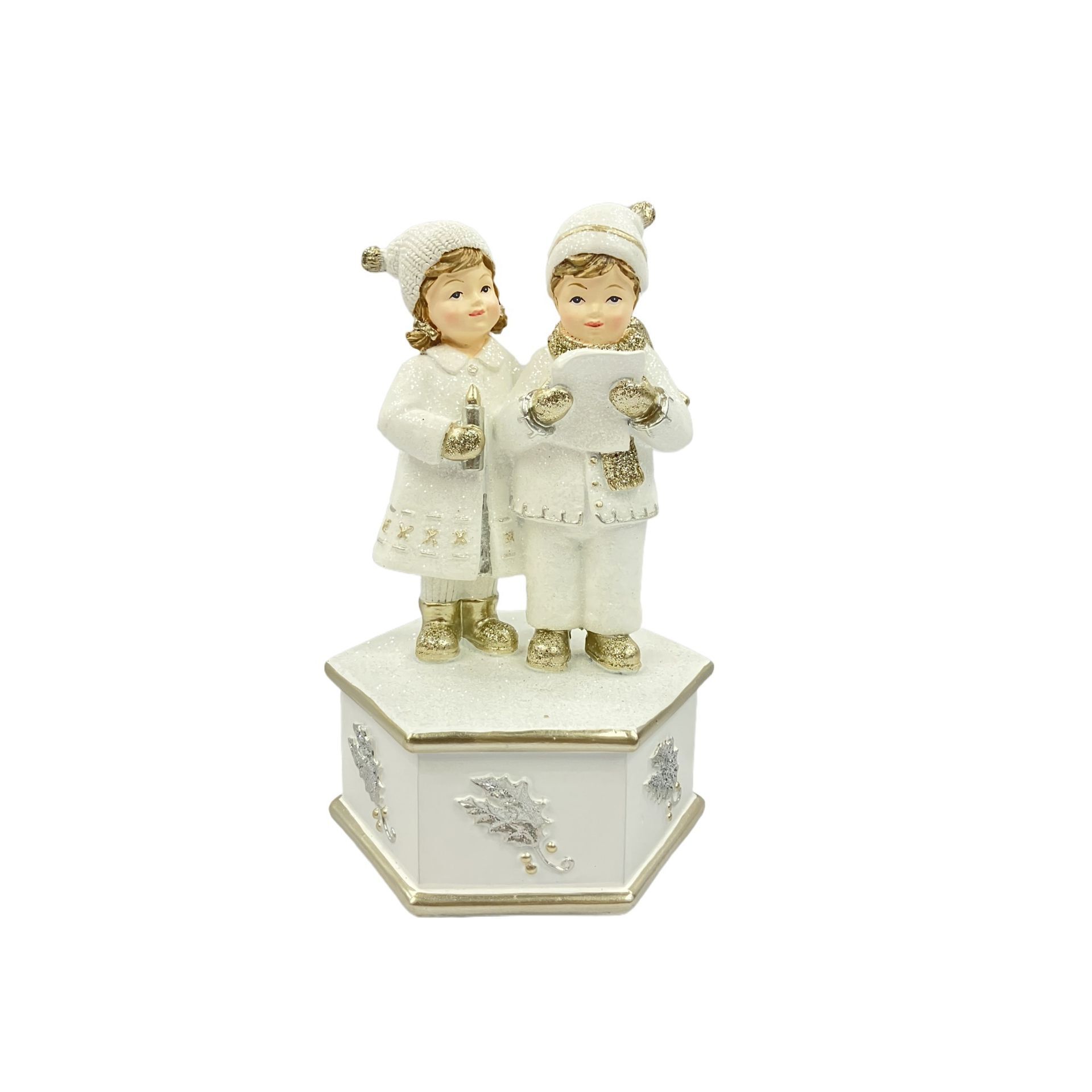The White and Gold Resin Musical Box - Children Carol Singers 17cm is a refined festive accent, ideal for elevating seasonal interiors. Two young children, a boy and a girl, are depicted in winter attire, standing on a hexagonal white base. Each holds a small object, possibly a candle or lantern, with subtle gold accents adding a gentle touch of warmth to the snowy resin finish. Complete the look with more serene pieces from the Frosted Haven collection.