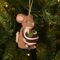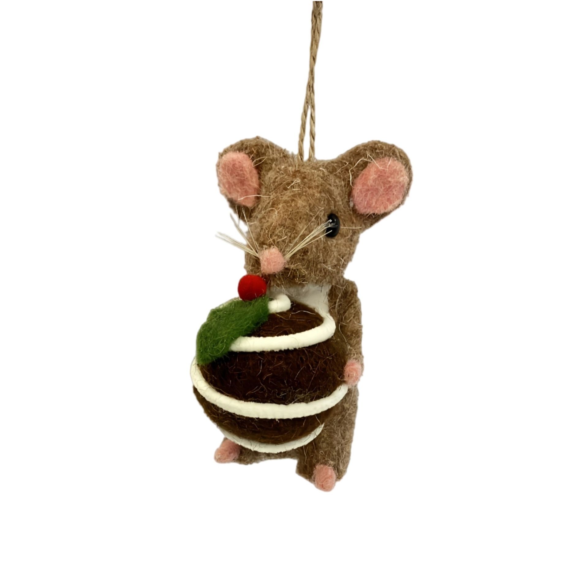A plush mouse ornament holds a Christmas pudding, crafted in soft felt with gentle natural tones and subtle details.