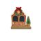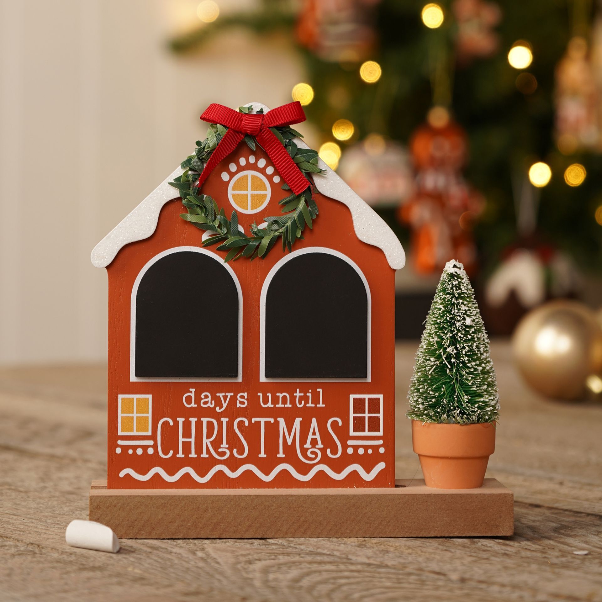 A wooden house-shaped decoration, it features a cheerful red bow, a countdown to Christmas chalk board, and a small Christmas tree set on a sturdy wooden base.
