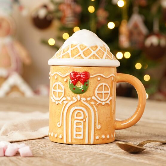 The Gingerbread House Mug with Lid brings a playful, festive accent to seasonal brews.