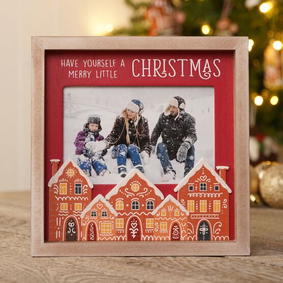 Decorated with a row of gingerbread houses, all set within a charming shadow box frame. Subtle candy-cane accents and smiling gingerbread characters add warmth and personality to favourite seasonal snaps.