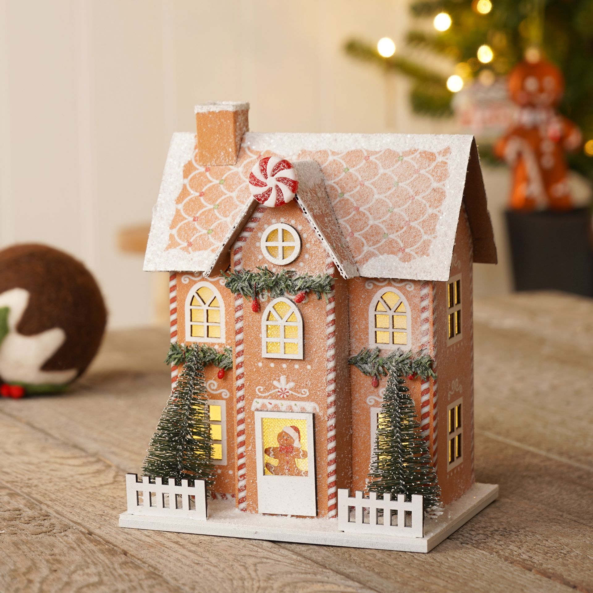 A gingerbread-style paper house with LED glow makes a playful addition to seasonal edits.