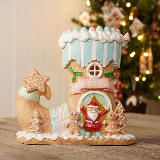 The LED Boot House Figurine is a sweet-inspired addition to seasonal decor. .