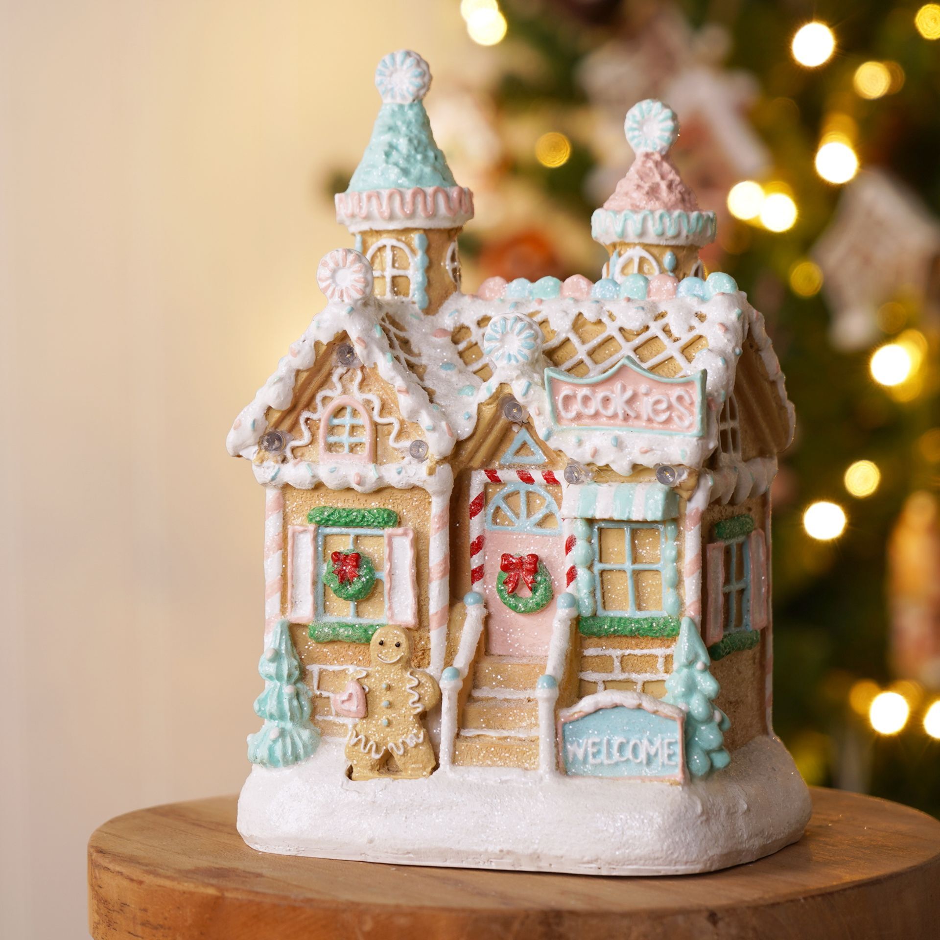 The LED Gingerbread House with Pink and White Frosting (Includes try me button) is a sweet-inspired centrepiece for festive interiors. A whimsical, snow-covered gingerbread house features soft pink and white frosting accents, with gentle LEDs to bring a glow. Pair with coordinating pieces from the Gingerbread Lane collection for a sugar-sweet seasonal display.