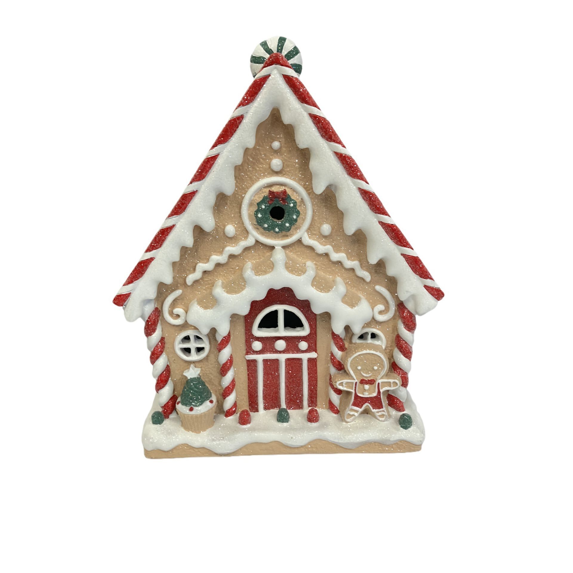 A gingerbread house with a red door, decorated with colourful candies and a star-shaped ornament on the roof. The red and white frosting effect adds a playful, nostalgic touch, while the integrated LED lights create a gentle glow.