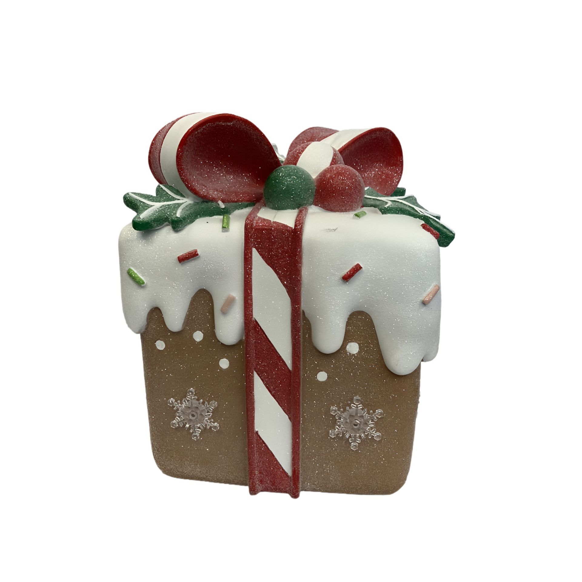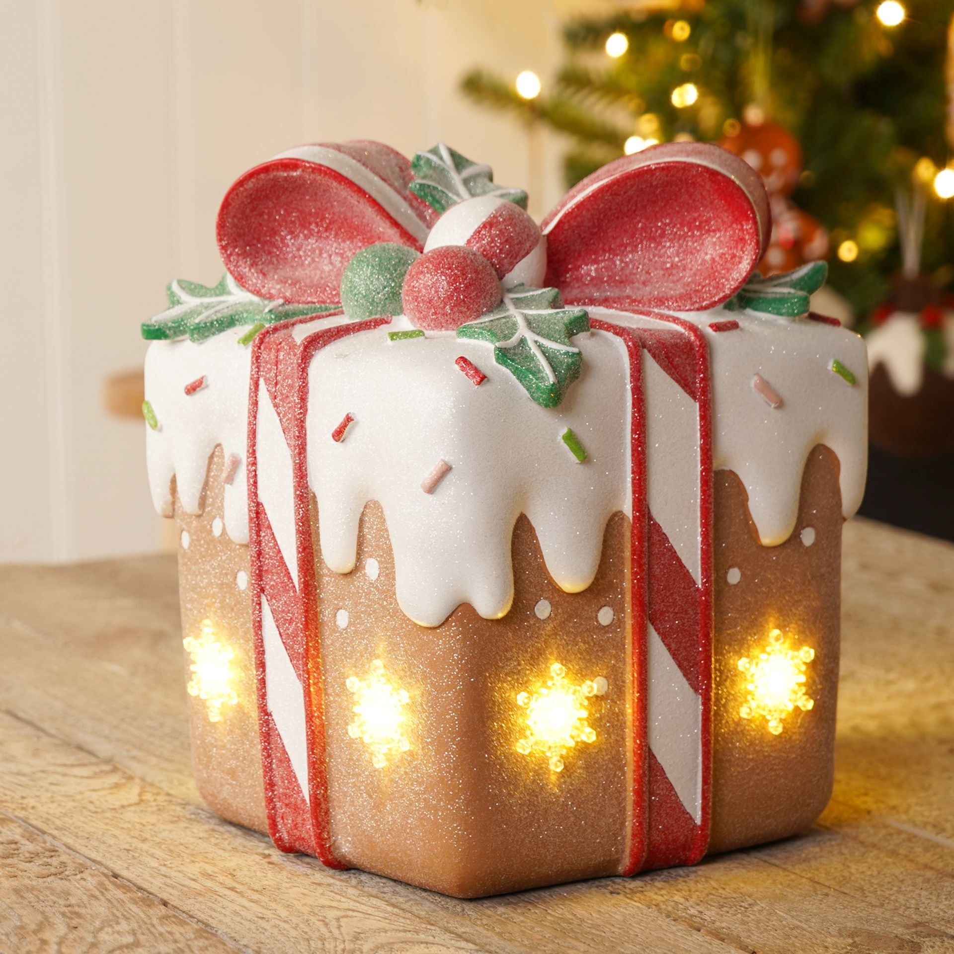 The Light Up Gingerbread Present with Frosting 26cm is a baking-inspired festive accent for seasonal interiors.