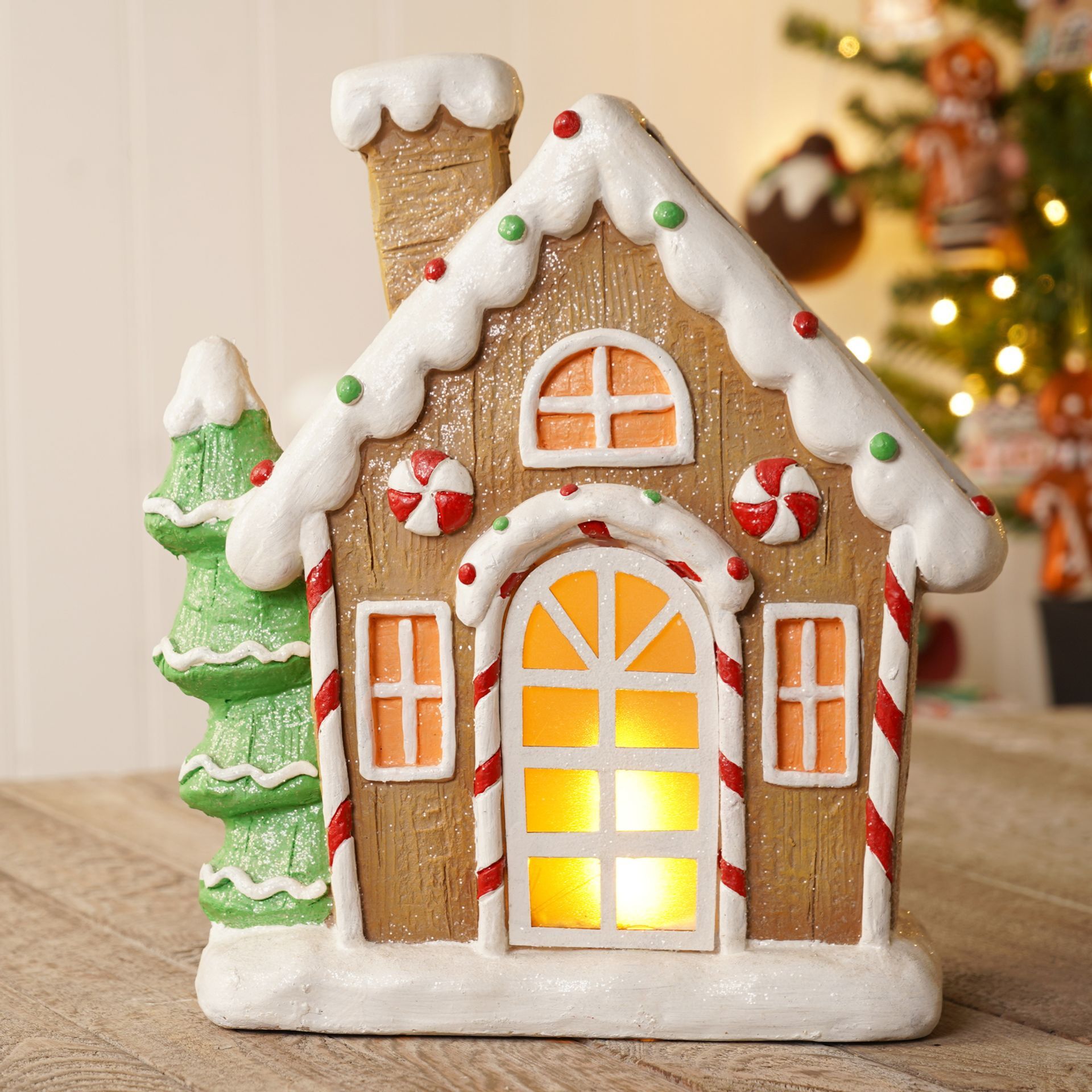 This wooden gingerbread house features a snowy roof, colourful candy decorations, and a gentle LED glow shining through its windows, creating a welcoming scene.