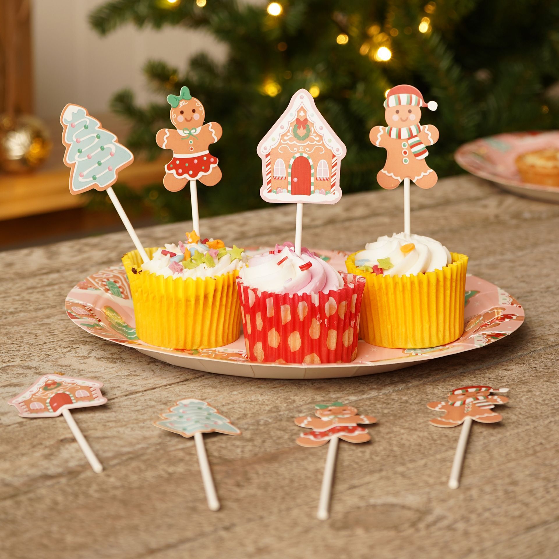 The set includes four Christmas-themed toppers: a gingerbread house, a Christmas tree, and two other designs, all on wooden sticks.