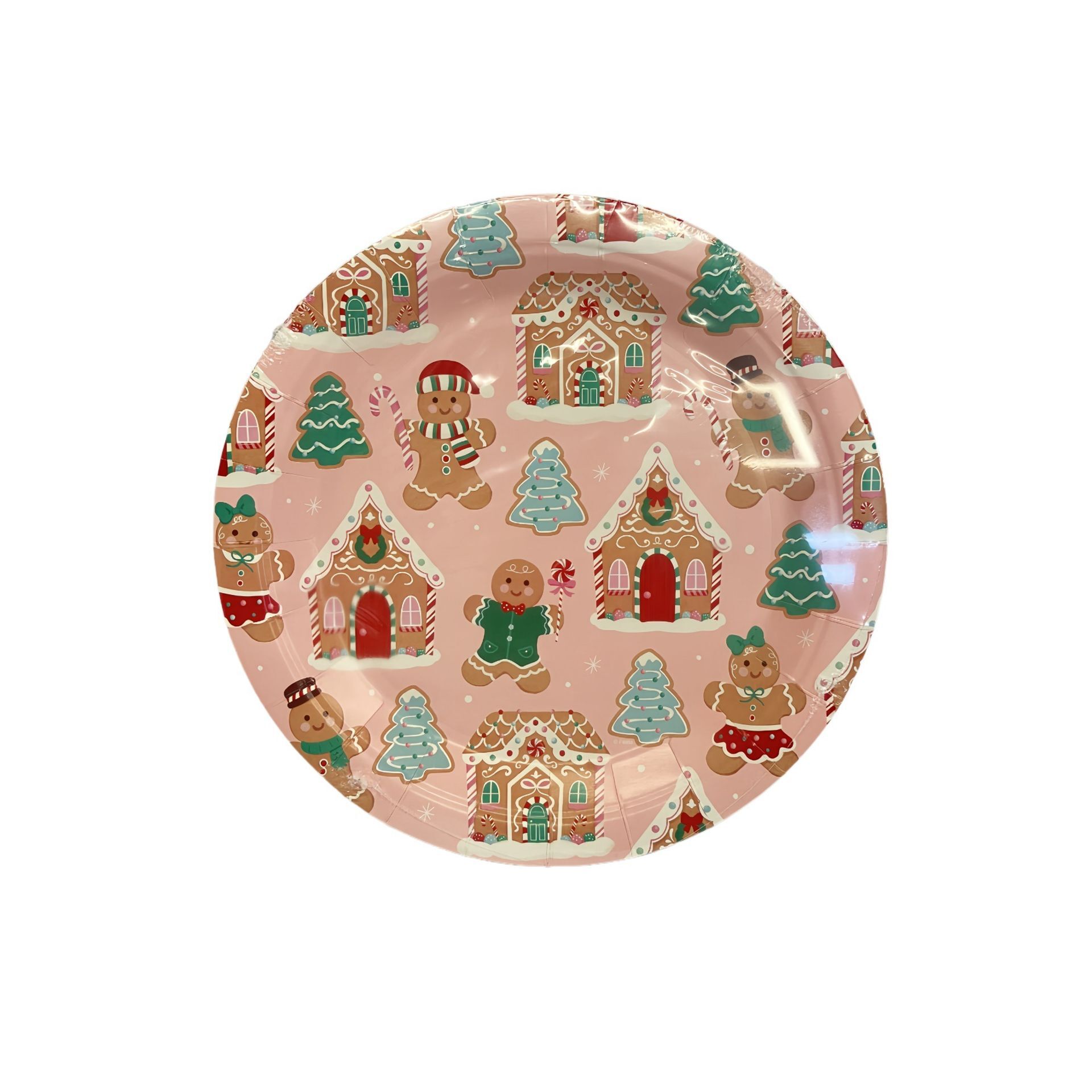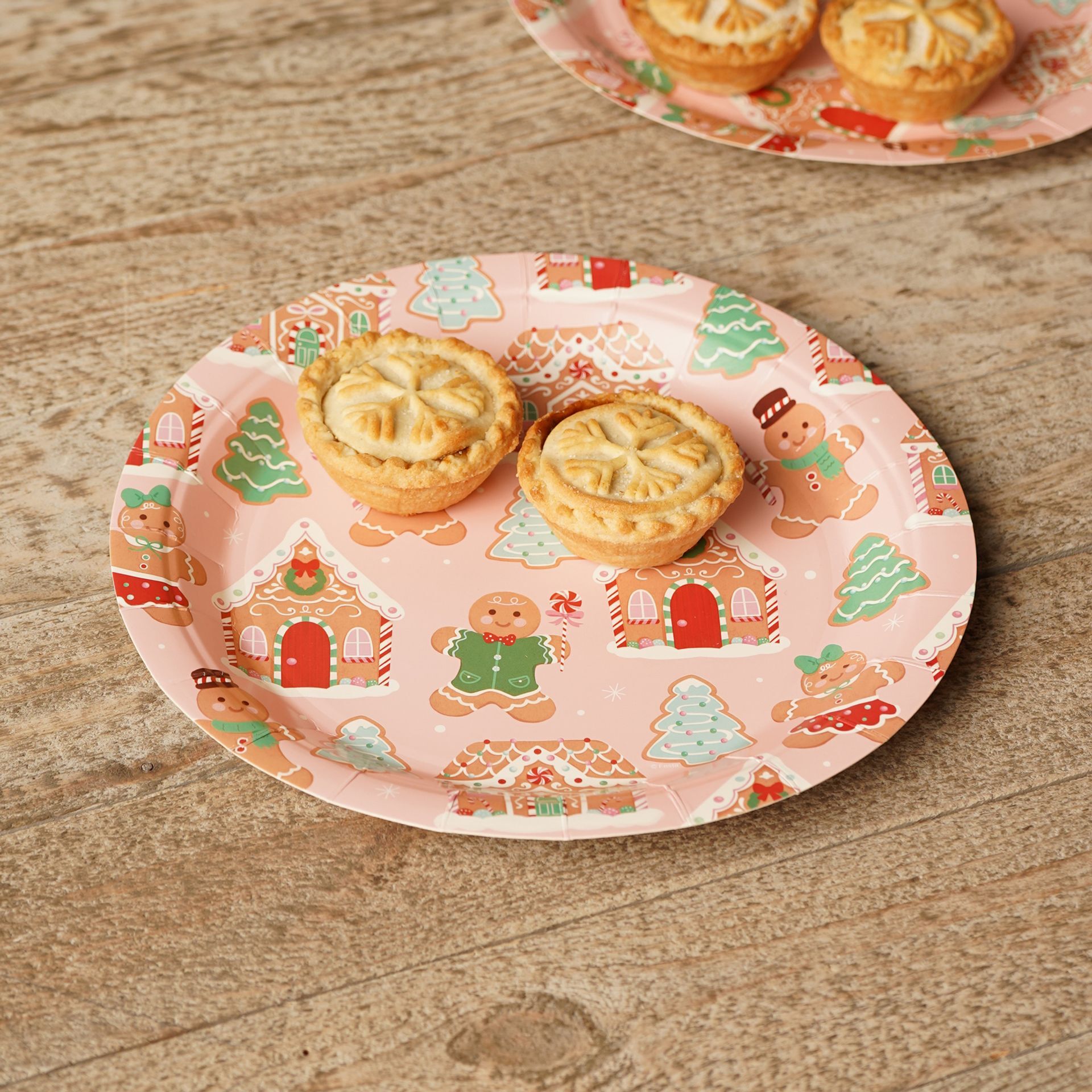 Each round plate features a pattern of gingerbread houses, Christmas trees, and smiling gingerbread figures, all in pastel hues. Made from 235gsm paper, these plates blend cheerful character with practical appeal.