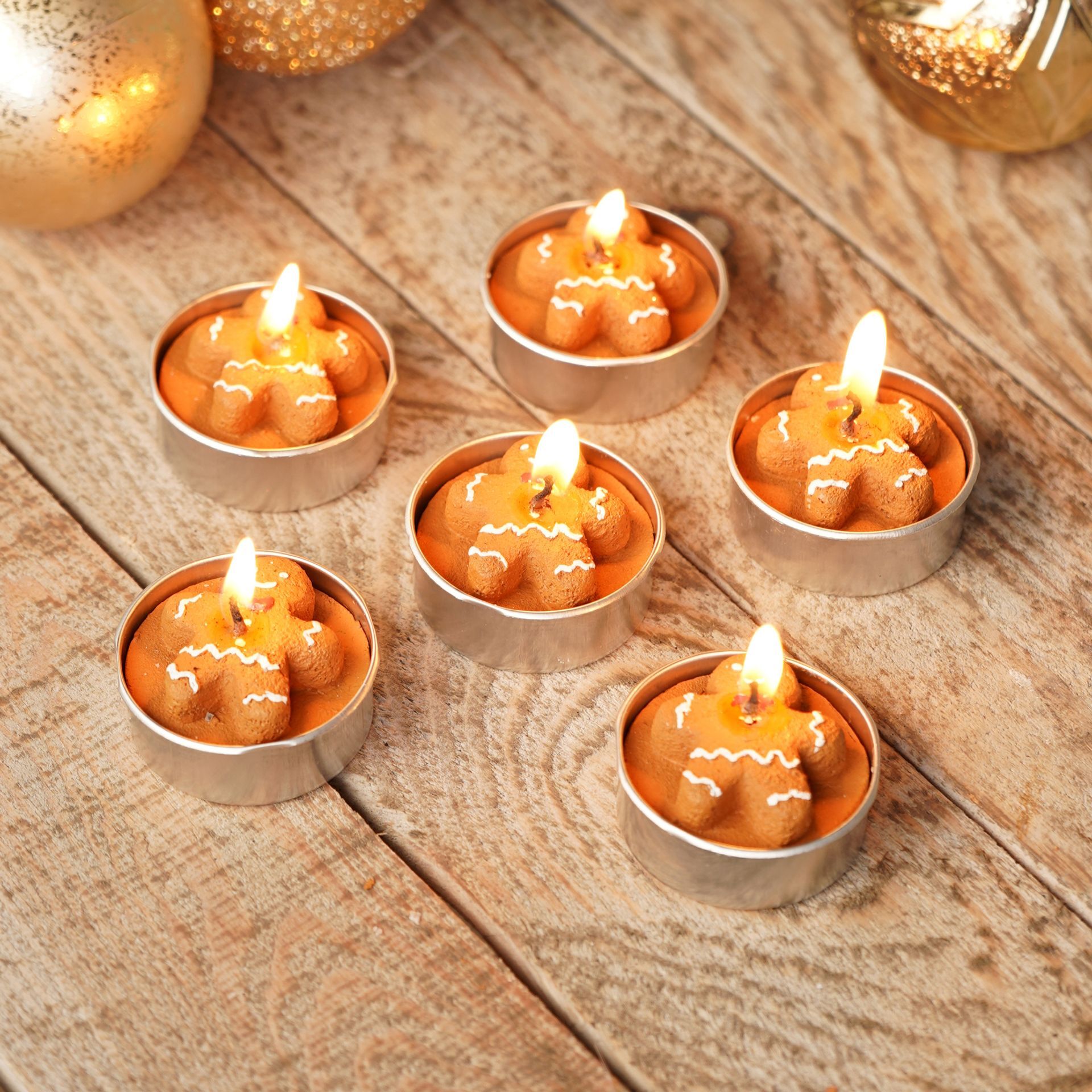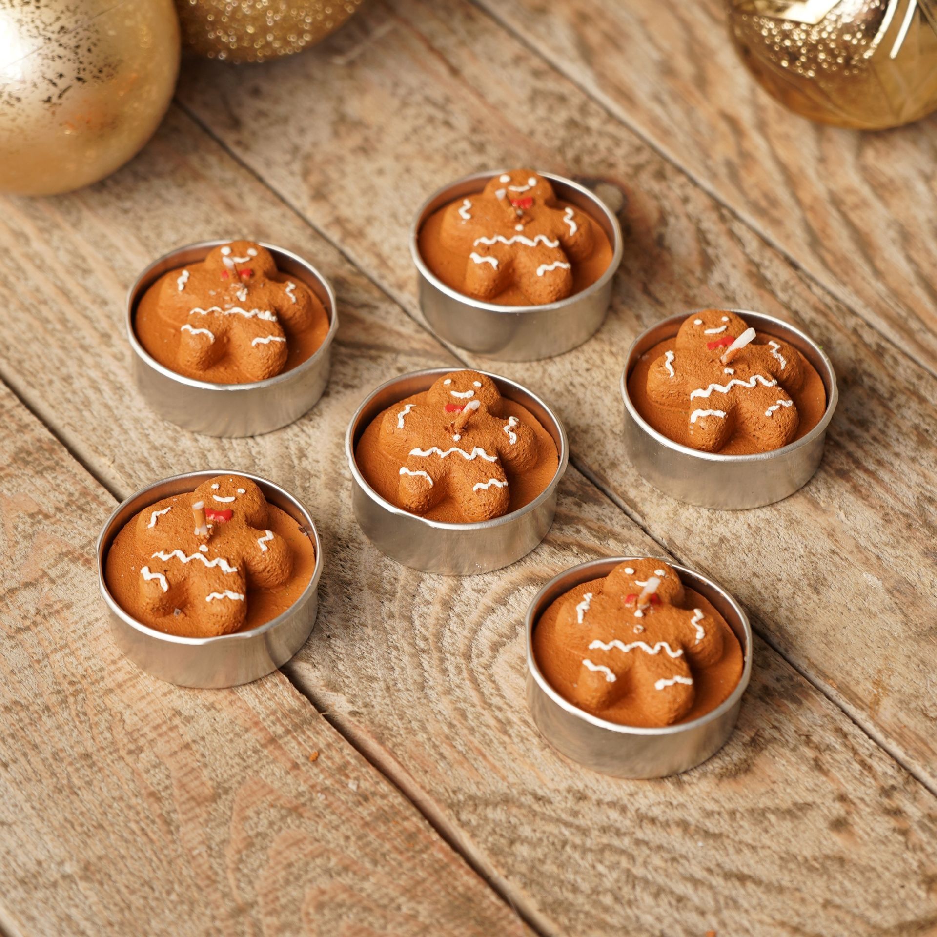 Presented in a rectangular box, each round, caramel-coloured tealight is topped with a smiling gingerbread man, capturing the charm of home baking and nostalgia.
