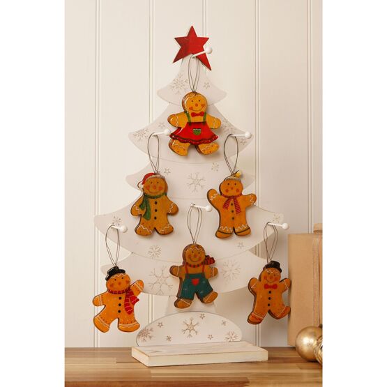 This wooden tree-shaped countertop display unit with hooks features six gingerbread-style decorations (48pcs) making a