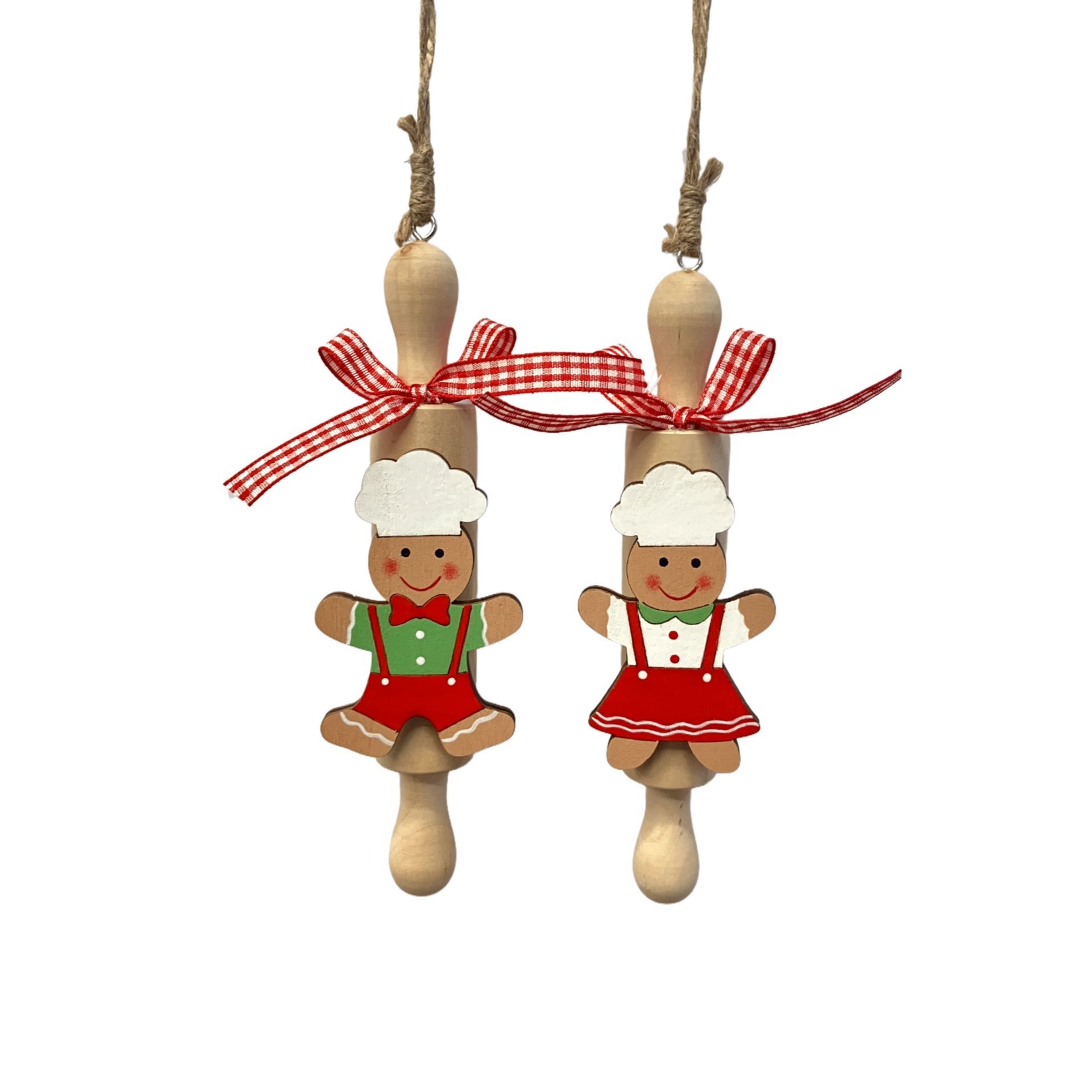 Two wooden figurines of gingerbread people, one male and one female, are dressed in classic red and green outfits.