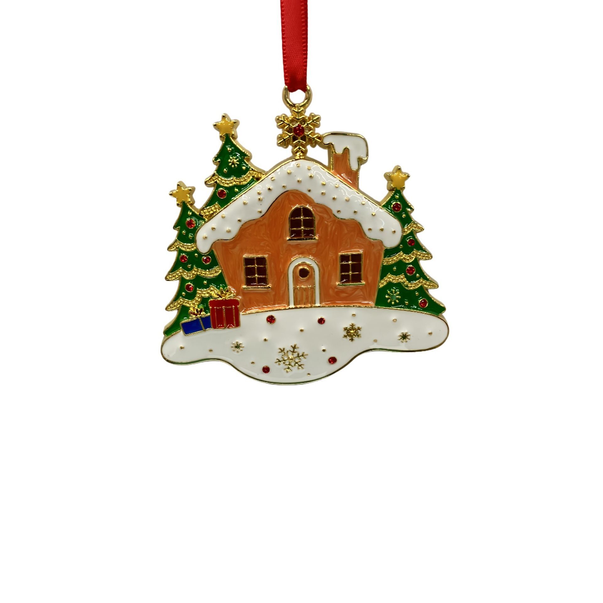 A festive Christmas ornament depicting a cosy gingerbread-style house surrounded by decorated Christmas trees and snowflakes, with a red ribbon for hanging. The design features warm brown tones, pops of green and red, and intricate icing-inspired details for a whimsical finish.