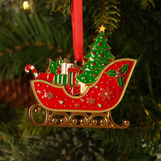 A festive Christmas sleigh ornament adorned with a decorated Christmas tree, presents, and other holiday-themed elements, finished in vibrant red and gold tones. The design blends nostalgic charm with a fresh, joyful character, perfect for contemporary Christmas decor.
