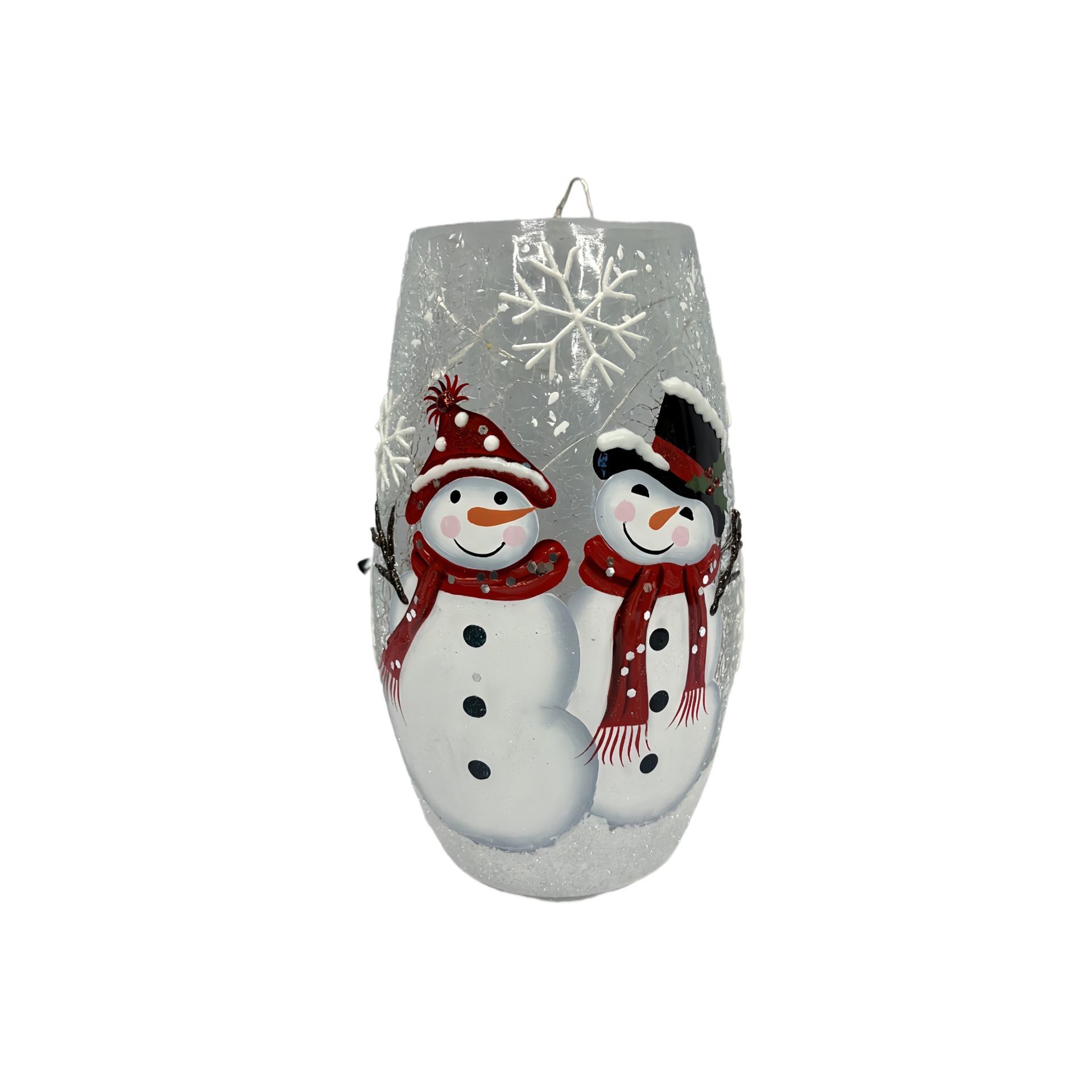 Featuring two cheerful snowmen in vibrant red hats and scarves, this crackle glass vase is adorned with a bold snowflake motif for a touch of seasonal charm. The textured glass finish adds a modern twist to classic Christmas imagery.