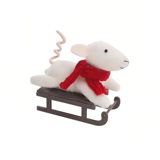 A fluffy white mouse, gliding on a wooden sleigh is joyful, whimsical addition to any tree.