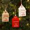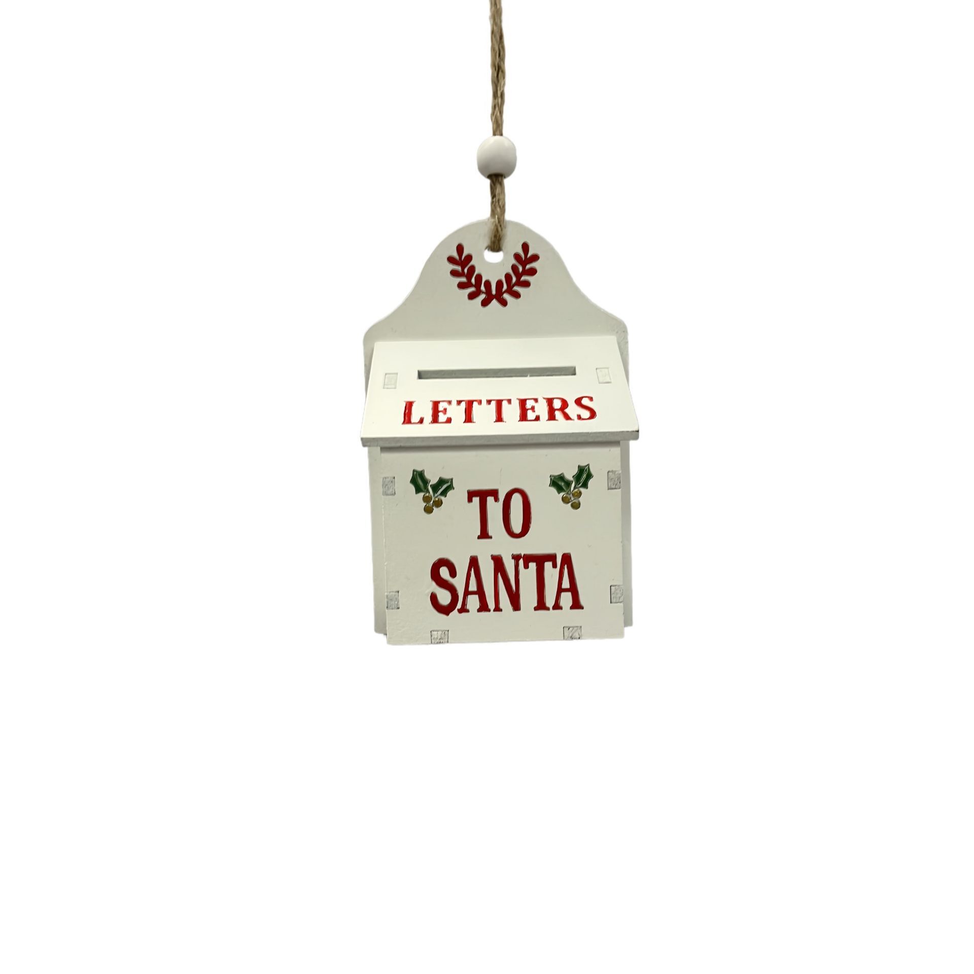 In white, brown and red, these wooden mailbox-shaped decorations features the text "LETTERS TO SANTA" in bold, accented by decorative holly leaves and suspended from a simple string. The crisp finish and cheerful details evoke a sense of childhood wonder.
