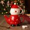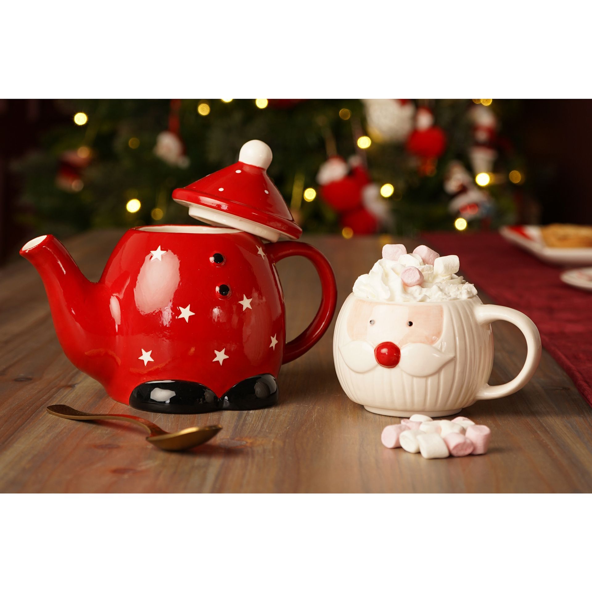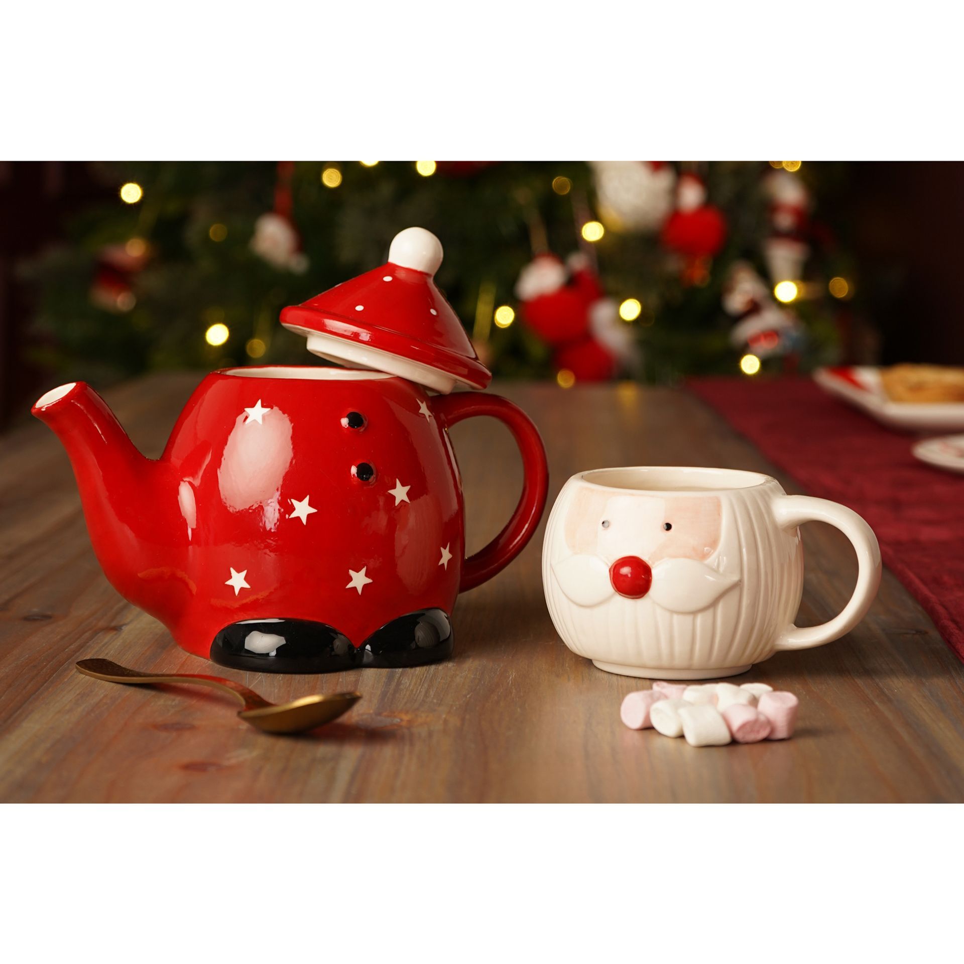 A festive red and white ceramic teapot and mug in the shape of a smiling Santa Claus, with a white pom-pom hat and stars decorating the surface. The matching mug nestles perfectly on top, creating a playful and practical set for seasonal sipping.