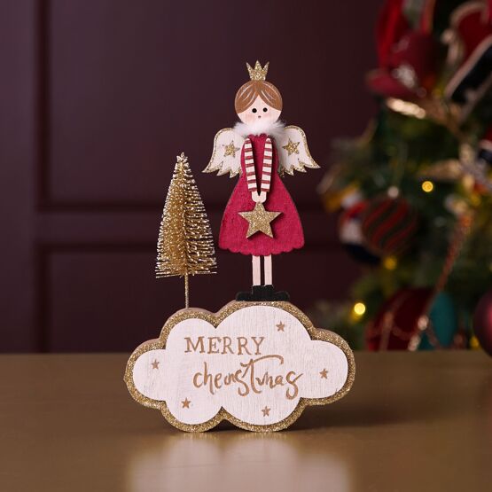 A festive Christmas decoration featuring a small angel figure standing on a cloud-shaped base with the text "Merry Christmas", alongside a miniature Christmas tree. The velvet and gold finish adds a touch of modern opulence to its classic silhouette.