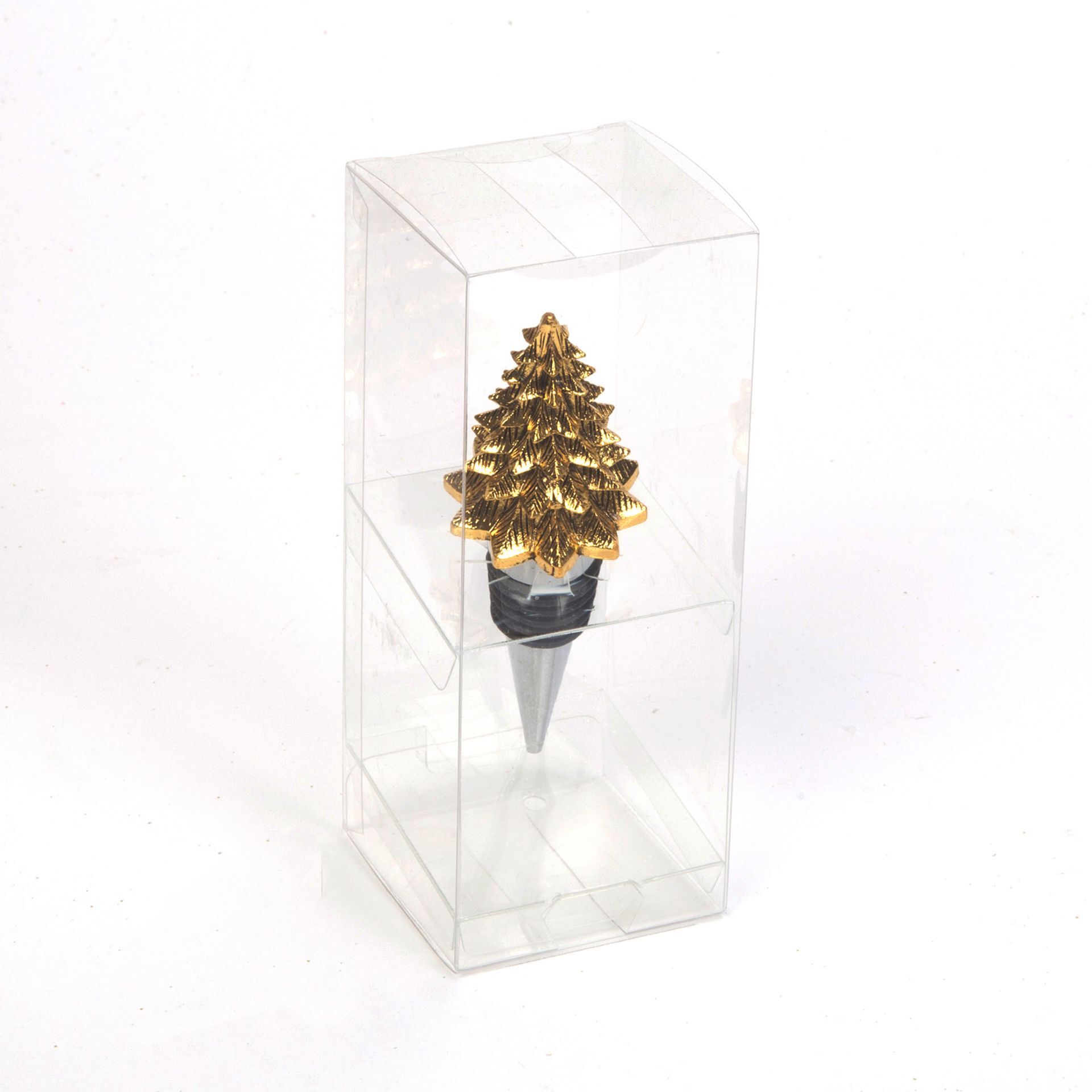 A stylish collection of gold finished bottle stoppers in a counter display unit. From the North Pole Novelties Co. by Santa's Workshop - the one stop shop for Christmas cheer!