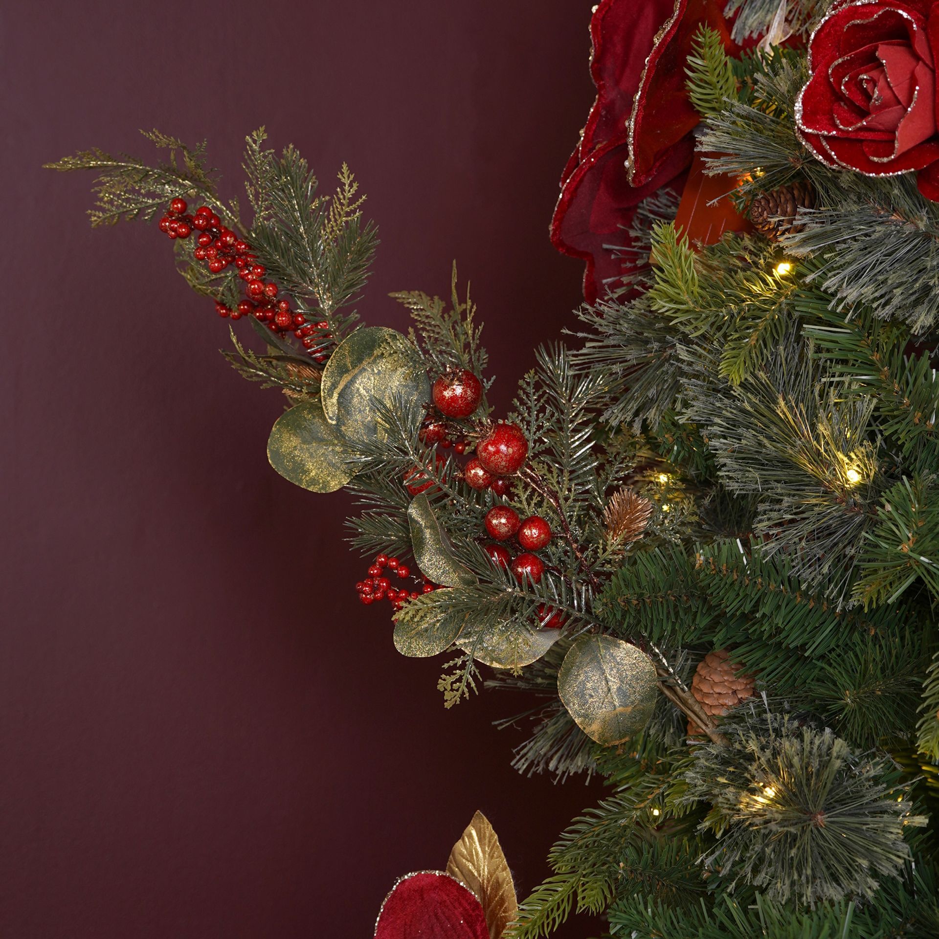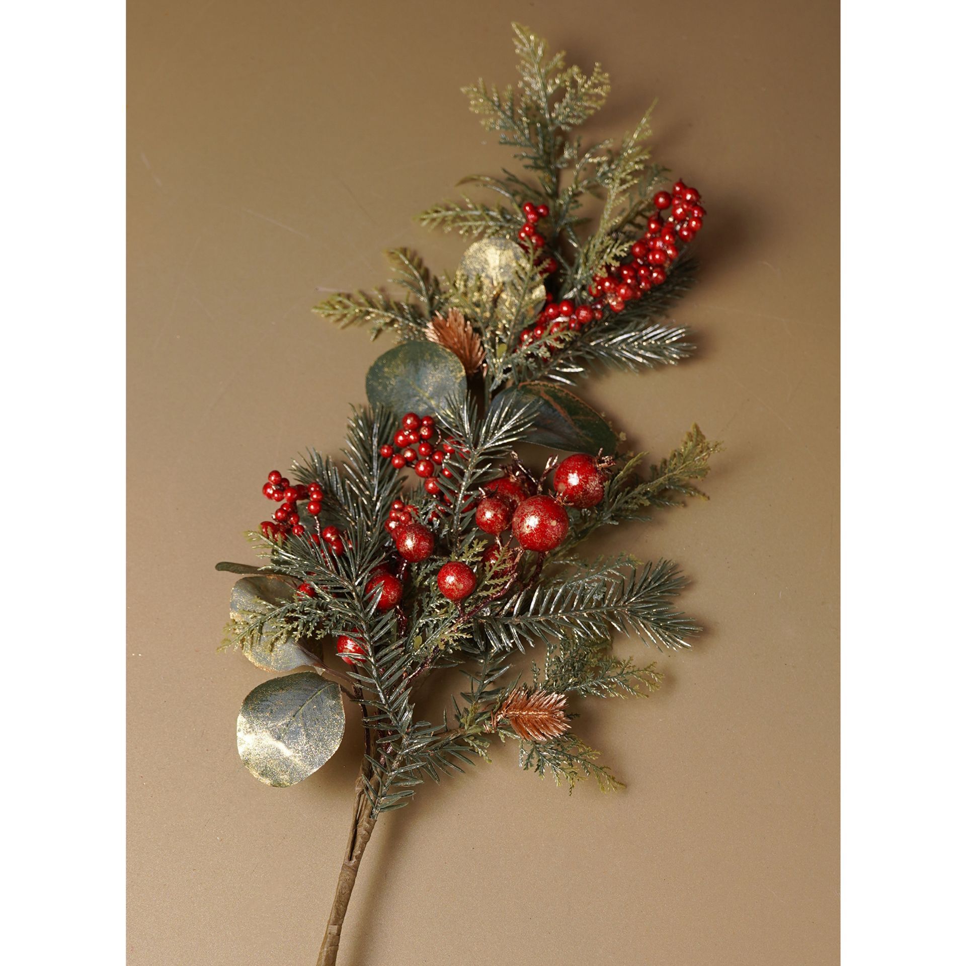 The image depicts a decorative floral arrangement featuring a variety of evergreen foliage, red berries, and pinecones, creating a festive and natural seasonal-inspired display. Accented with golden sparkle, this stem adds a refined touch to wreaths, vases, or table centrepieces.
