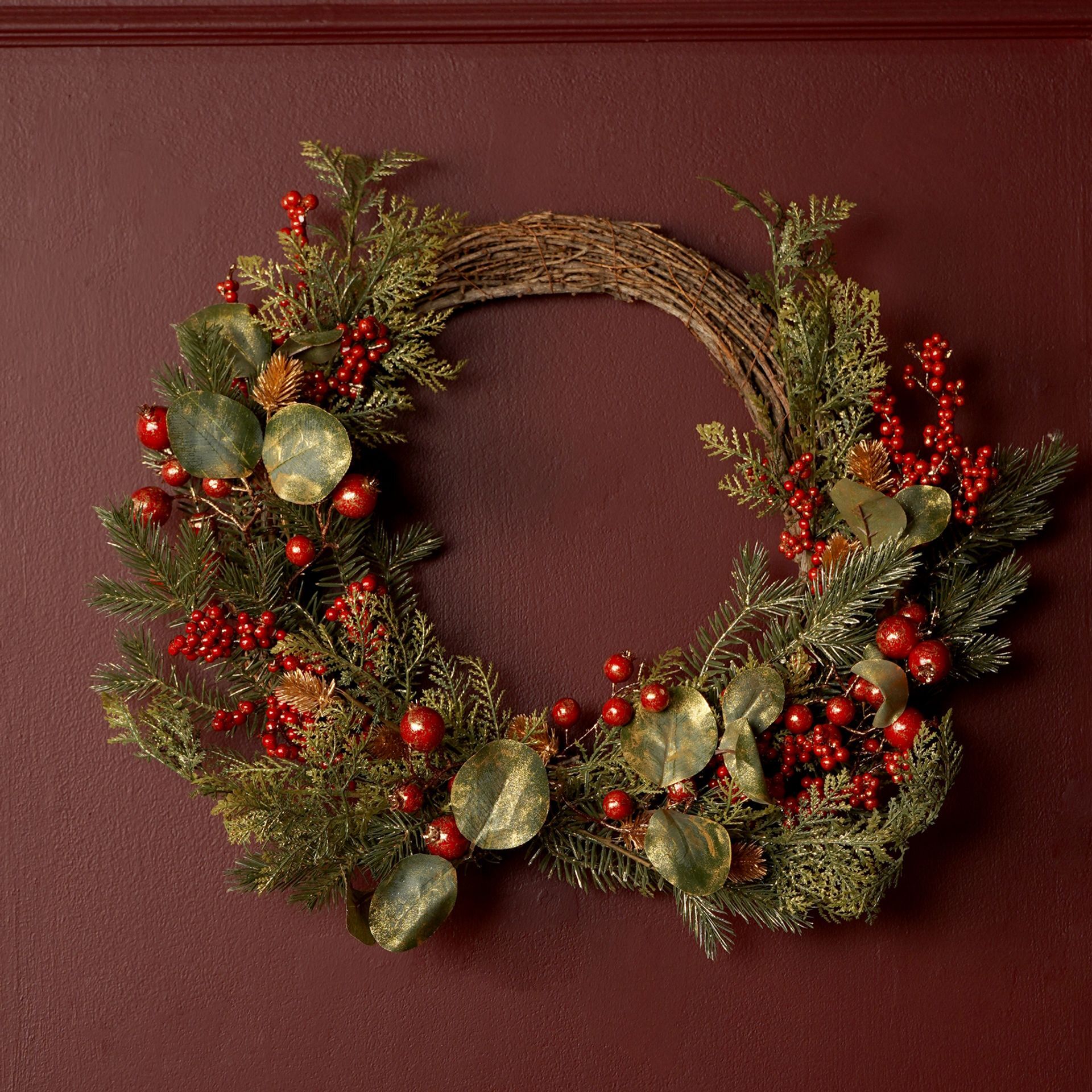 Golden Sparkle Wreath Pine Foliage with Red Berries and Leaves 45cm