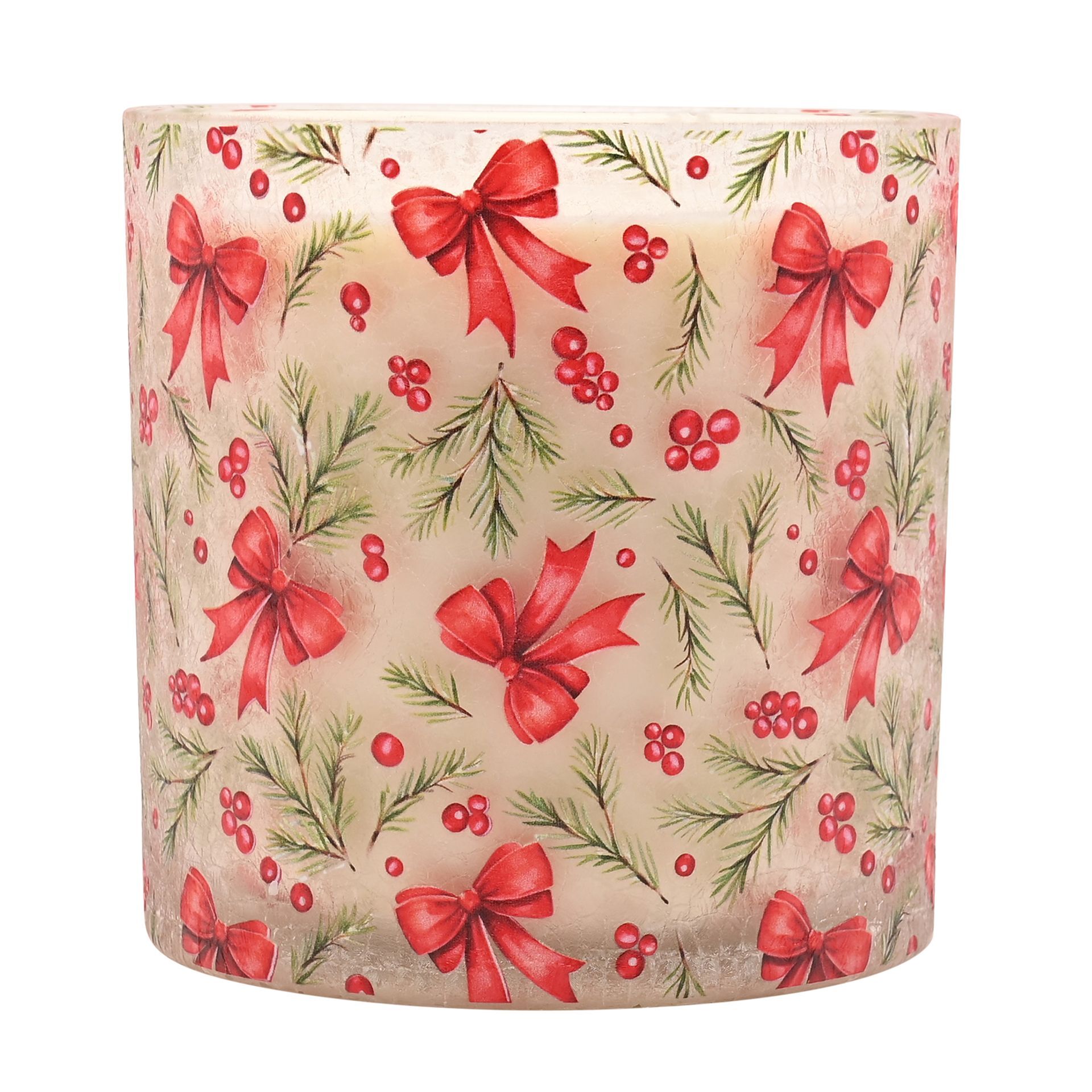 The festive pattern featuring red bows, pine branches, and red berries, creating a cheerful and nostalgic design. The candles smooth vessel and vibrant accents evoke the warmth of home-baked treats and joyful gatherings.