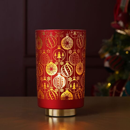 The LED Light Up Metallic Gold and Red Glass Lantern with Bauble Pattern brings festive illumination and refined style to seasonal interiors. A red glass lantern with a metallic gold finish, featuring a decorative bauble pattern in various shapes and designs. Integrated LED lighting creates a warm, inviting glow, enhancing the intricate detailing and rich colour palette. Complete the look with more refined designs from the Regal Tidings collection.
