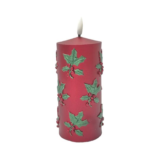 A red cylindrical candle is adorned with embossed green holly leaves and vibrant red berries, creating a cheerful and classic Christmas motif. The LED feature offers a warm, inviting light, perfect for cosy evenings.