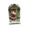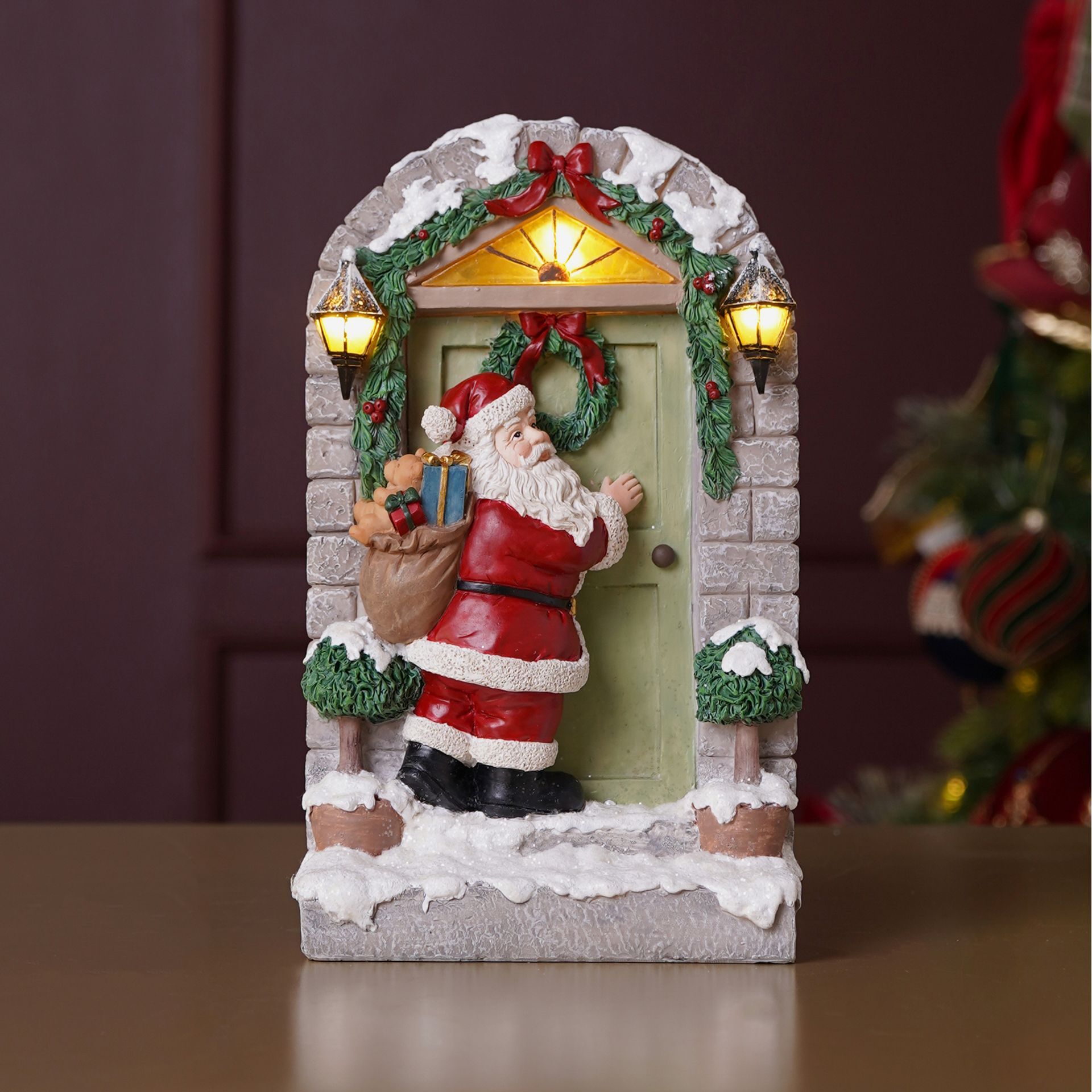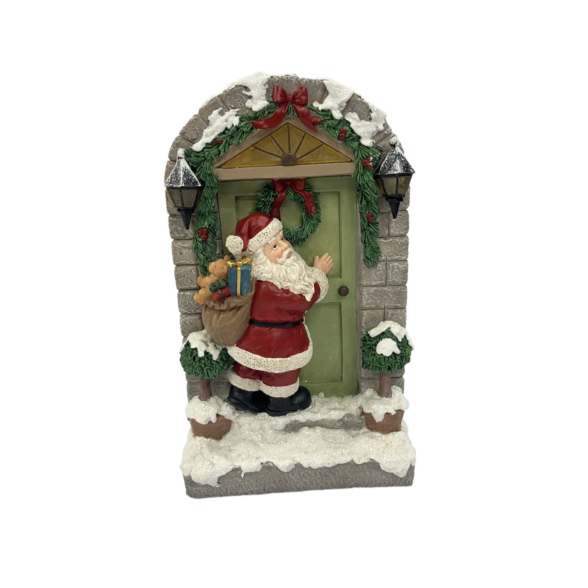 The Light Up Christmas Scene Figurine with Santa at Door (Includes try me button) batteries not included brings festive charm to any seasonal display. A festively decorated doorway with a Santa Claus figure stands in the snow-covered entrance, holding a gift-wrapped present. Subtle illumination highlights the scene, adding a gentle glow to the intricate detailing and classic Christmas palette. Complete the look with more refined designs from the Regal Tidings collection.