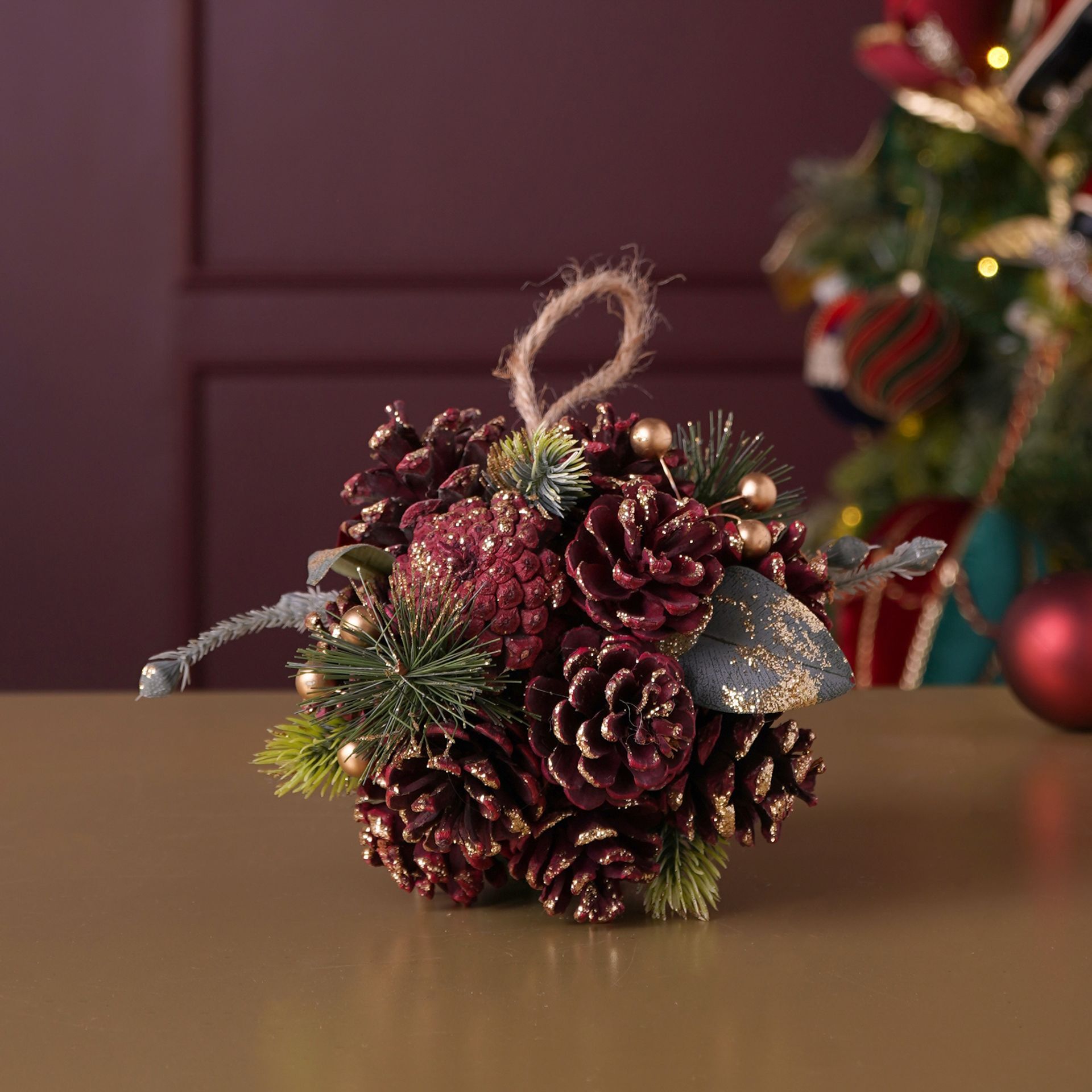 A festive seasonal decoration composed of pine cones, evergreen branches, and a red flower, suspended from a string. The rich red, gold, and green tones offer a classic yet refined accent for seasonal displays.
