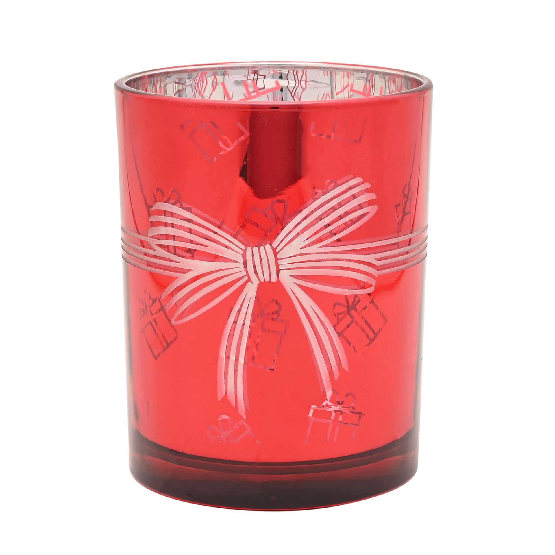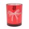 A red glass candle holder with a white bow-like pattern etched onto its surface, this piece combines playful charm with a refined finish. The filled candle offers a gentle glow, enhancing seasonal ambience.